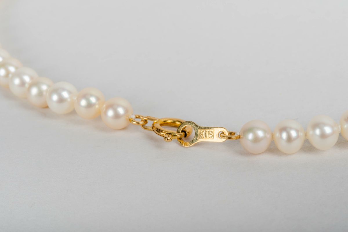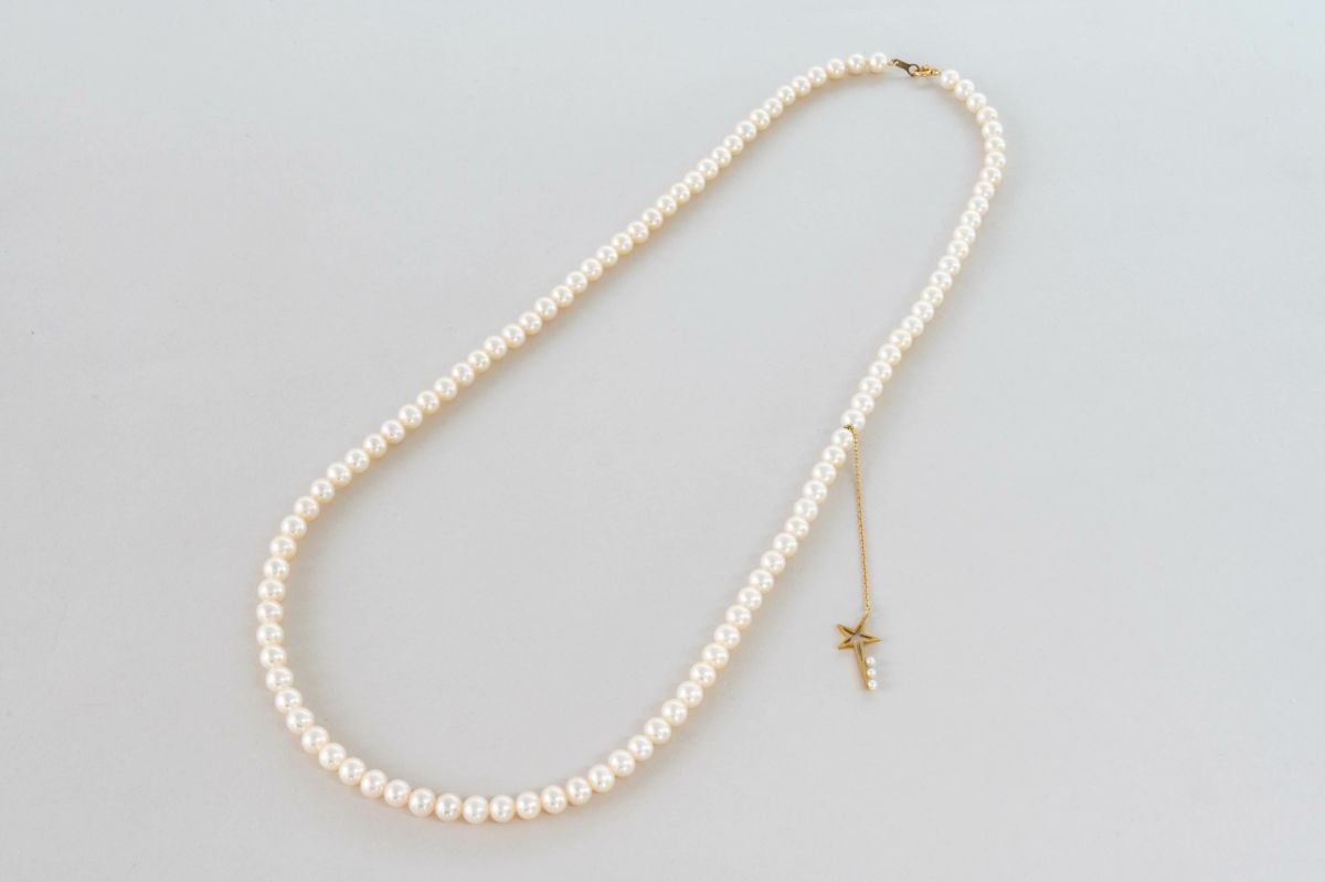 程よいサイズ感の5mmの淡水パールの連のネックレスにK18YGで施されたオリジナルデザインのスターモチーフをあしらったデザイン。スターは2mmの極小の珠を芯立てして留める細やかな仕上げをし、チェーンで垂らしてアクセントに。53cmの服の開きを選ばない長さは使いやすく、どんなスタイリングにも合わせられます。