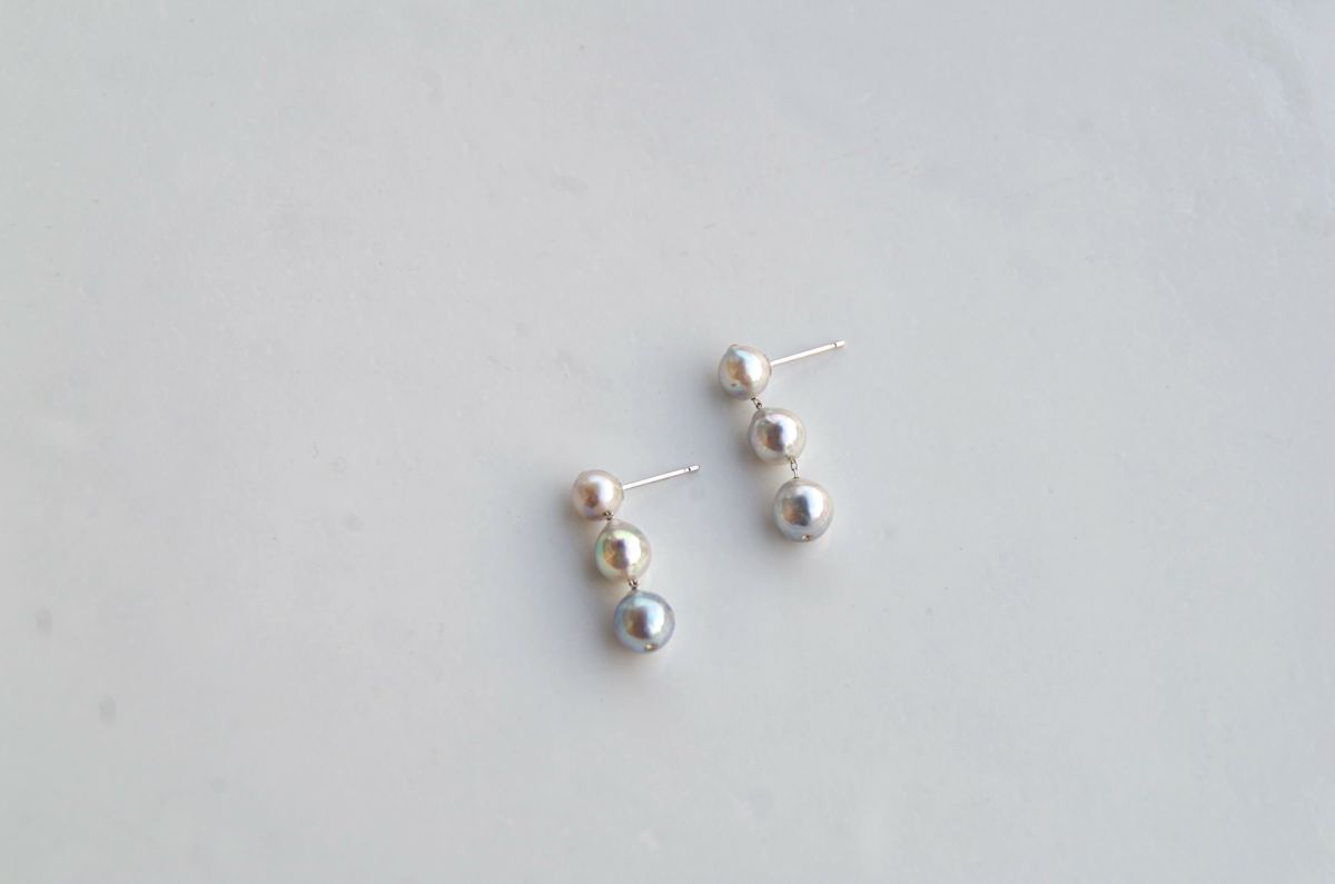 無調色真珠ならではの自然が育んだ色味を堪能できるアコヤパールナチュラルグレーカラー。ブルーが強かったり少しピンク味があったりと様々な色味のナチュラルグレーのバロックパールをチェーンに散りばめたピアスは揺れながら光に当たると美しい真珠の照りを堪能いただけます。他にはない自然が生み出した美しさで顔周りを華やかに演出します。