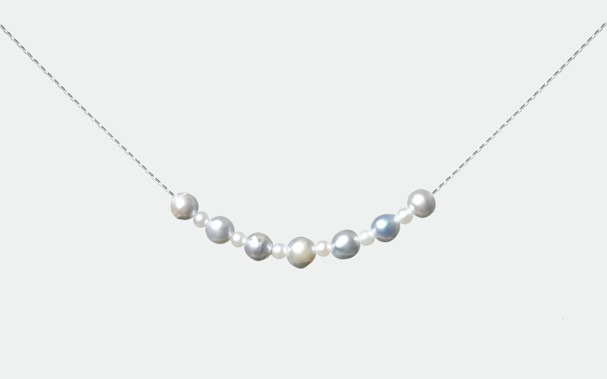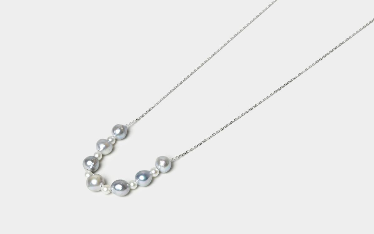 無調色真珠ならではの自然が育んだ美しいナチュラルグレーカラーのアコヤパールとホワイトのベビーパールを交互に通したスルールースネックレス。チェーンはピンスライドタイプで長さを自由に調整できます。スルールースを取り外すこともできるので、その日の気分でつける色味や数も自由自在にアレンジできます。シンプルでありながらバリエーション豊かなネックレスをお楽しみください。