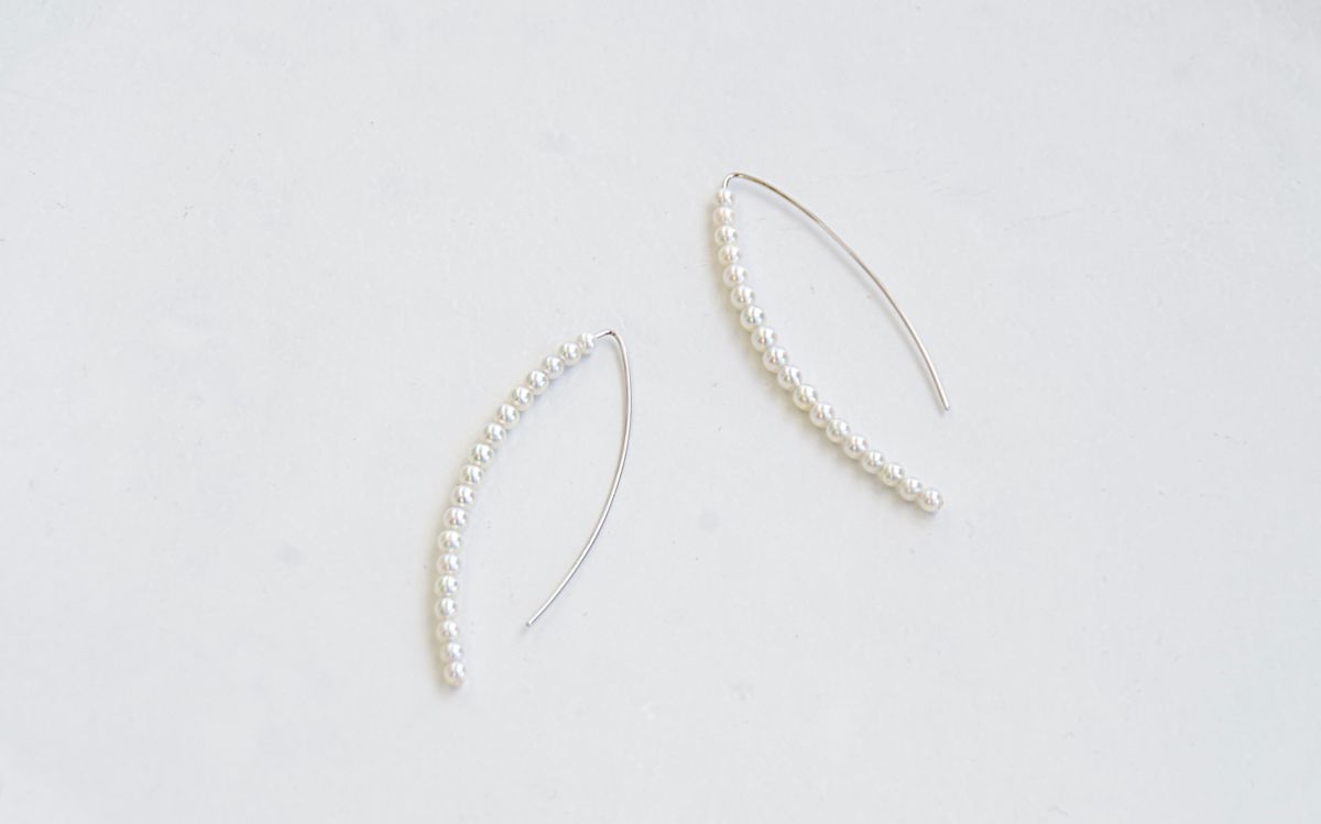 アコヤの3mmのベビーパールで美しいアーチを描くフープピアス。すっきりとしたラインで他にない存在感を印象付けます。プラチナのホワイトカラーが無調色真珠ならではのアコヤパールの色味と照りの美しさを際立たせます。様々なシーンでワンランク上のスタイリングに。
