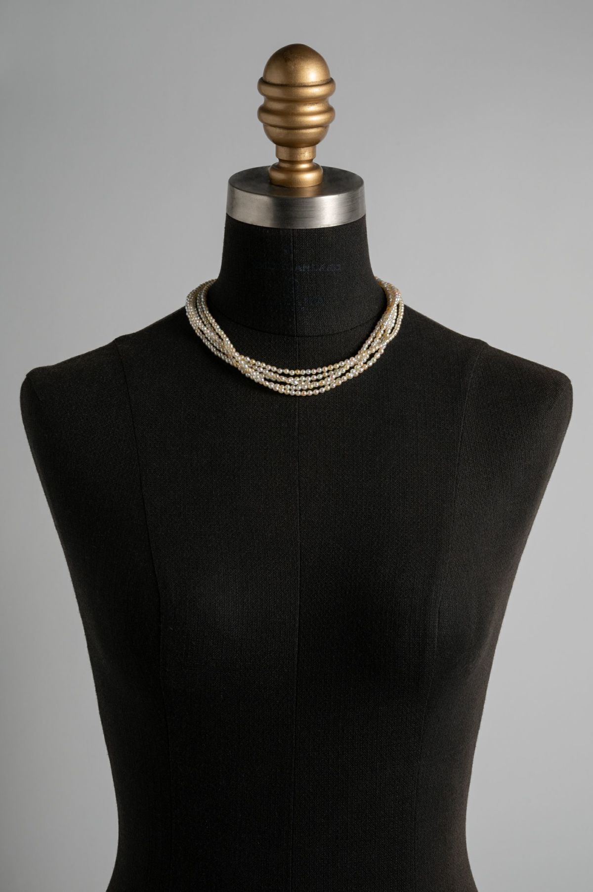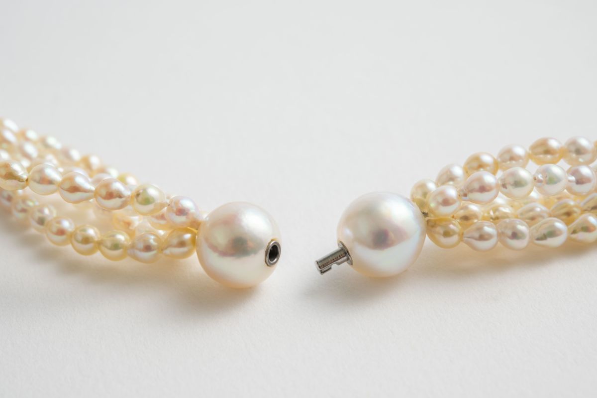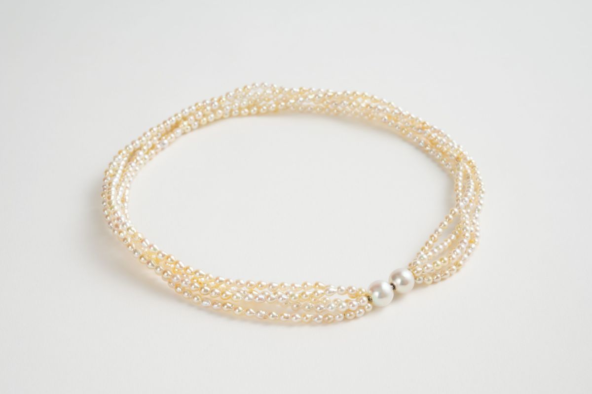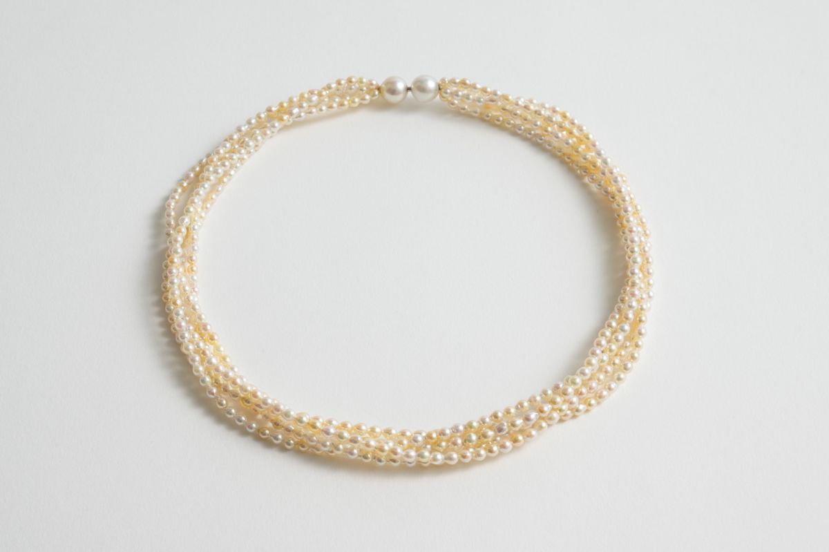 無調色真珠ならではの自然が育んだ形と色味を堪能できるコレクション。希少なバロックのベビーパールは自然が生み出したクリームやホワイトなどのマルチカラー。これを贅沢に5連にしたネックレスはボリューム感あるデザイン。パールの中に埋め込まれた<MADAMA>オリジナルのクラスプは、回しながら差し込みねじると留められ、互いを押し合いねじると外れます。つなぎ目が見えず、どの角度からでもきれいにお着けいただけます。他のモジュールと合わせればロングネックレスとしてもお楽しみいただけます。色味も形も個性豊かな、他にはないパールネックレスをお楽しみください。
