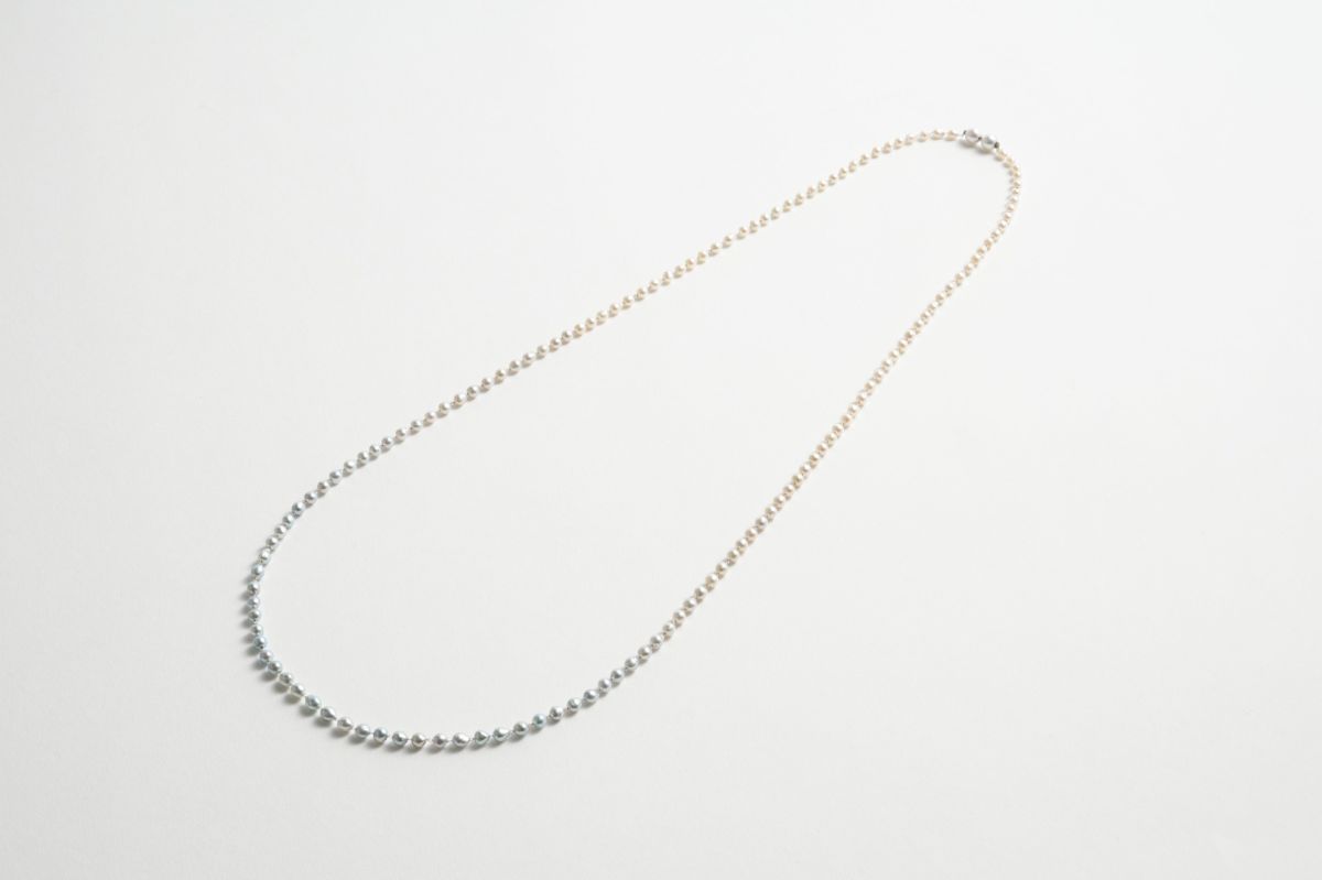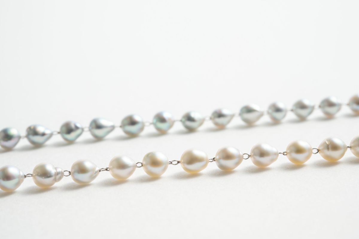 マダマの無調色真珠ならではの色味が堪能できるロングネックレス。希少なアコヤのベビーパールをホワイトからナチュラルグレーのカラーグラデーションにデザイン。細やかな作業で1コマずつのステーションにすることで自然が育んだバロックの形を際立たせてくれて、落ち感も糸よりも美しいアーチを描きます。パールの中に埋め込まれたマダマオリジナルのクラスプは、回しながら差し込みねじると留められ、互いを押し合いねじると外れます。つなぎ目が見えず、どの角度からでもきれいにお付けいただけます。他のモジュールと合わせれば色々なデザインのロングネックレスとしてもお楽しみいただけます。