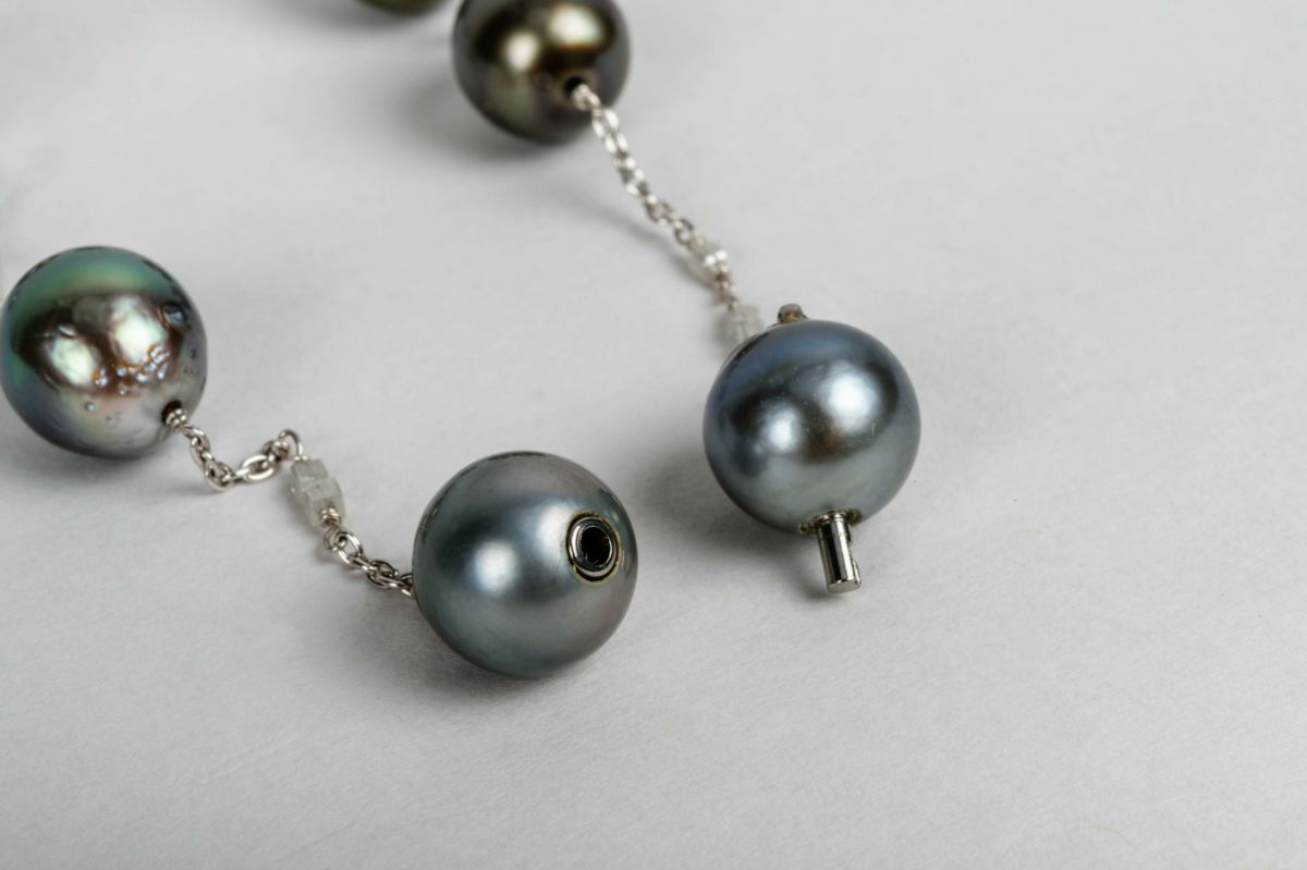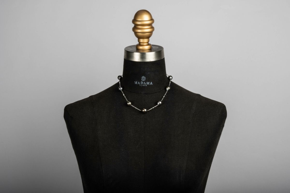 無調色真珠ならではの自然が育んだ美しい色味を堪能できる黒蝶パールに、キューブ状のダイヤモンドを散りばめたステーションネックレス。黒蝶パールのバロックの形はどんなスタイリングにも合わせやすく、華やかなドレスアップにもカジュアルスタイルでもなじむアイテムです。K18のホワイトゴールドの色味と黒蝶パールの黒、そしてダイヤモンドのグレーでワントーンにまとまったすっきりとしたカラーで首元をシャープにみせてくれます。パールの中に埋め込まれた<MADAMA>オリジナルのクラスプは、回しながら差し込みねじると留められ、互いを押し合いねじると外れます。つなぎ目が見えず、どの角度からでもきれいにお着けいただけます。他のモジュールと合わせればロングネックレスとしてもお楽しみいただけます。