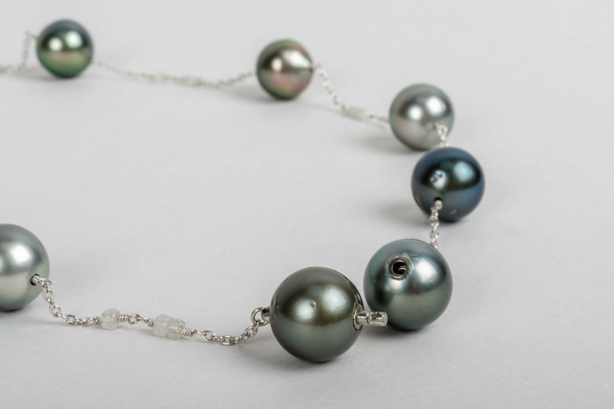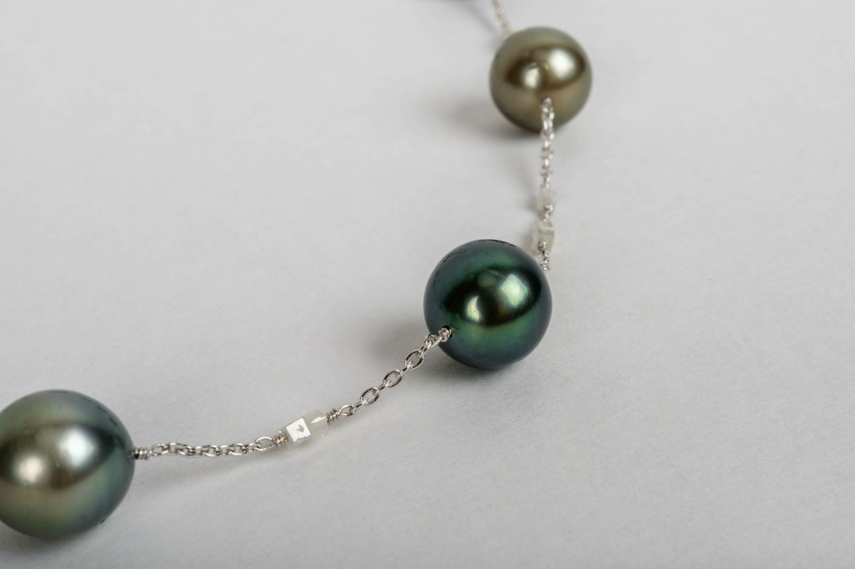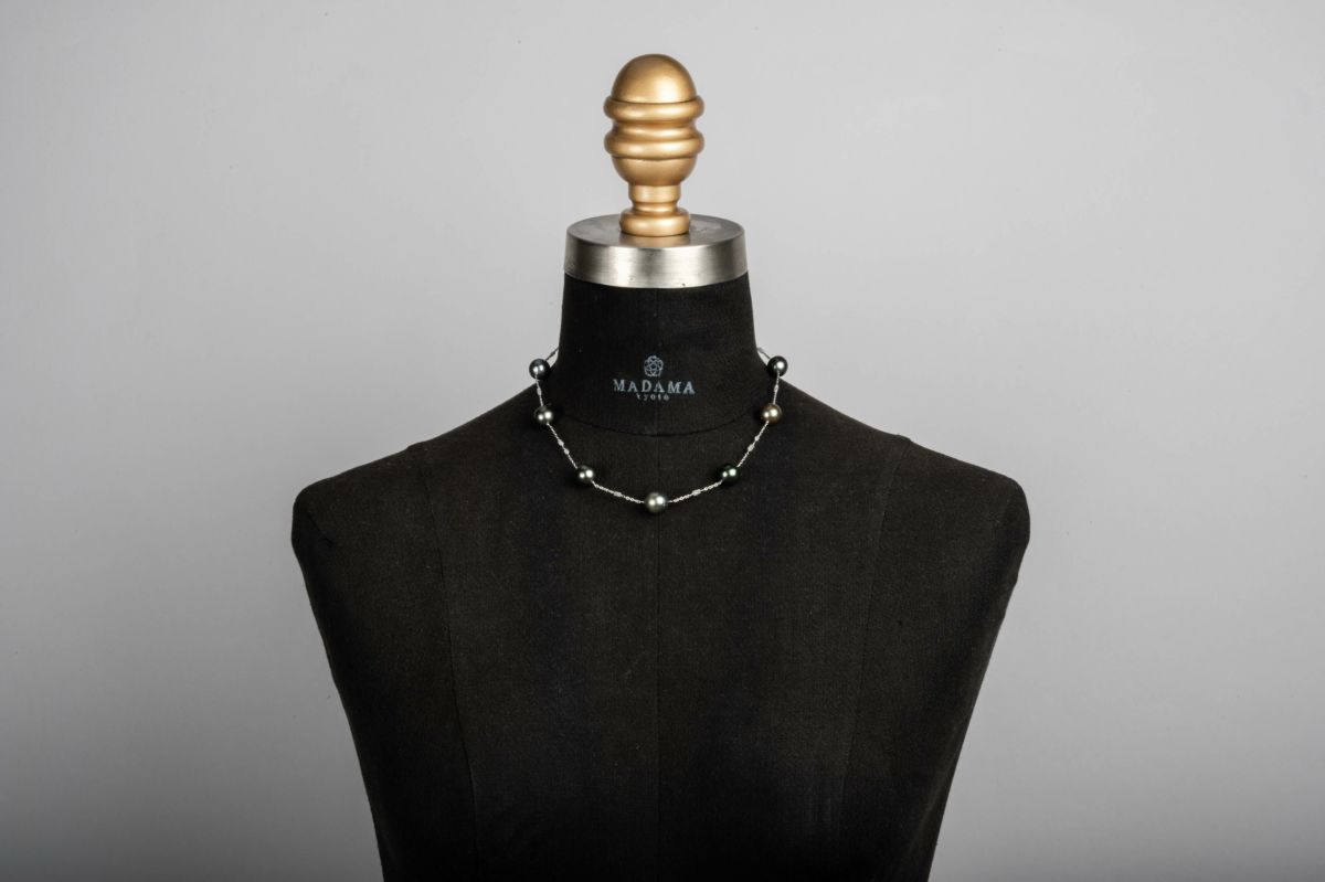 無調色真珠ならではの自然が育んだ美しい色味を堪能できる黒蝶パールに、キューブ状のダイヤモンドを散りばめたステーションネックレス。黒蝶パールの10mmのラウンドが高級感がありながらステーションデザインなので軽やかにお着けいただけます。K18のホワイトゴールドの色味と黒蝶パールの黒、そしてダイヤモンドのグレーでワントーンにまとまったすっきりとしたカラーで首元をシャープにみせてくれます。パールの中に埋め込まれた<MADAMA>オリジナルのクラスプは、回しながら差し込みねじると留められ、互いを押し合いねじると外れます。つなぎ目が見えず、どの角度からでもきれいにお着けいただけます。他のモジュールと合わせればロングネックレスとしてもお楽しみいただけます。