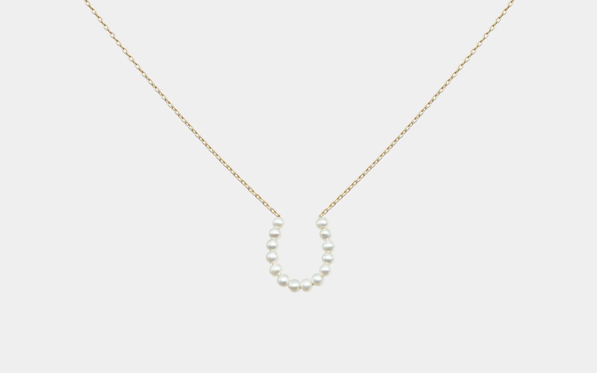 淡水のベビーパールを馬蹄のモチーフにしたネックレス。パールのみでシンプルなデザインでチェーン部分はピンスライドで長さを自由に調整できます。