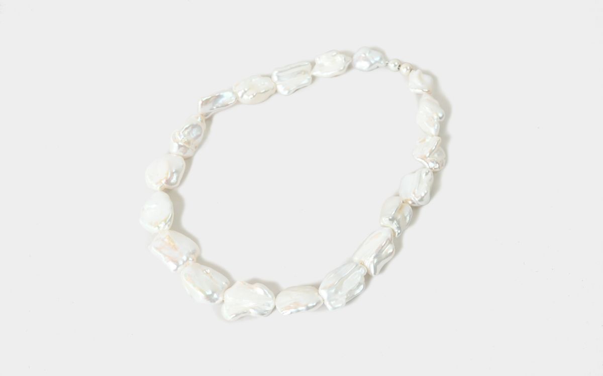 淡水の大珠の板ケシバロックパールのネックレス。自然が育んだ個性豊な形は他にない存在感に。板状のものはラウンドとも通常のバロックともまた違った印象です。パールの中に埋め込まれた<MADAMA>オリジナルのクラスプは、回しながら差し込みねじると留められ、互いを押し合いねじると外れます。つなぎ目が見えず、どの角度からでもきれいにお着けいただけます。単品でネックレスとしてボリューム感と形を楽しむのはもちろん、他のモジュールと合わせれば個性的なロングネックレスとしてもお楽しみいただけます。