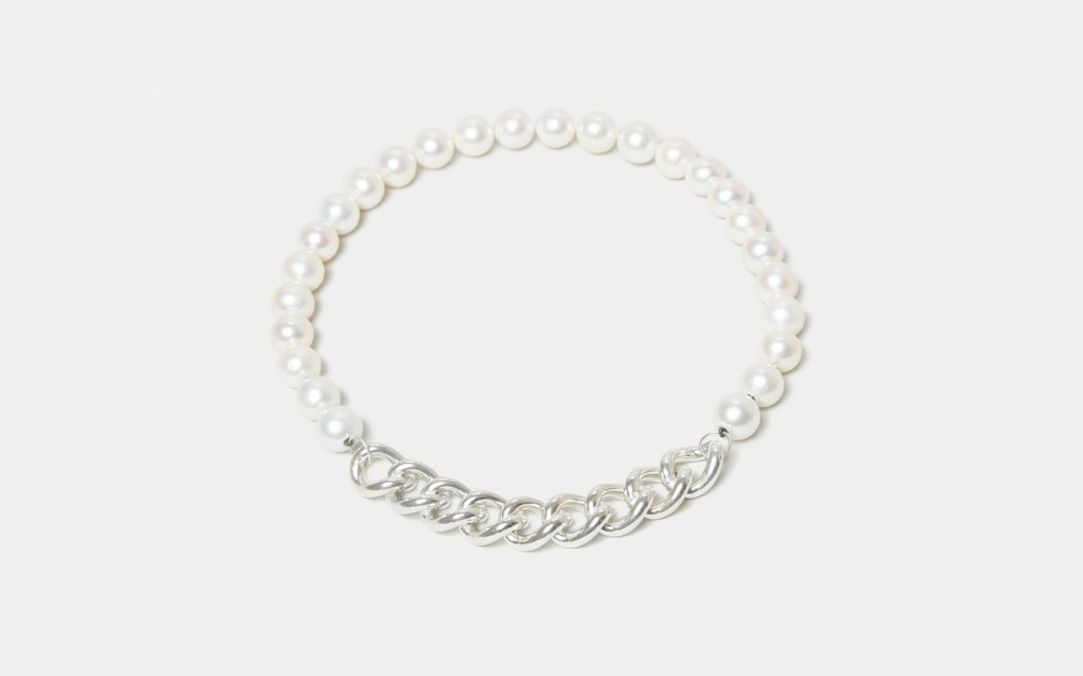 希少な淡水の大珠ラウンドのパールのモジュールに存在感抜群なシルバーチェーンモジュールを組み合わせたデザイン。パールの中に埋め込まれた<MADAMA>オリジナルのクラスプは、回しながら差し込みねじると留められ、互いを押し合いねじると外れます。つなぎ目が見えず、どの角度からでもきれいにお着けいただけます。チョーカーサイズの長さでチェーン部分の位置によって印象が変えられます。ドレスアップからカジュアルまでマルチに使いこなせるアイテムです。