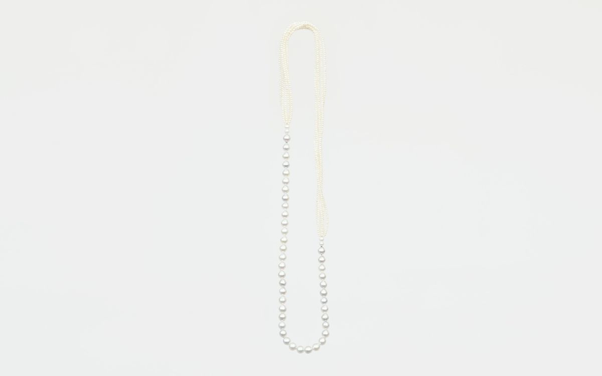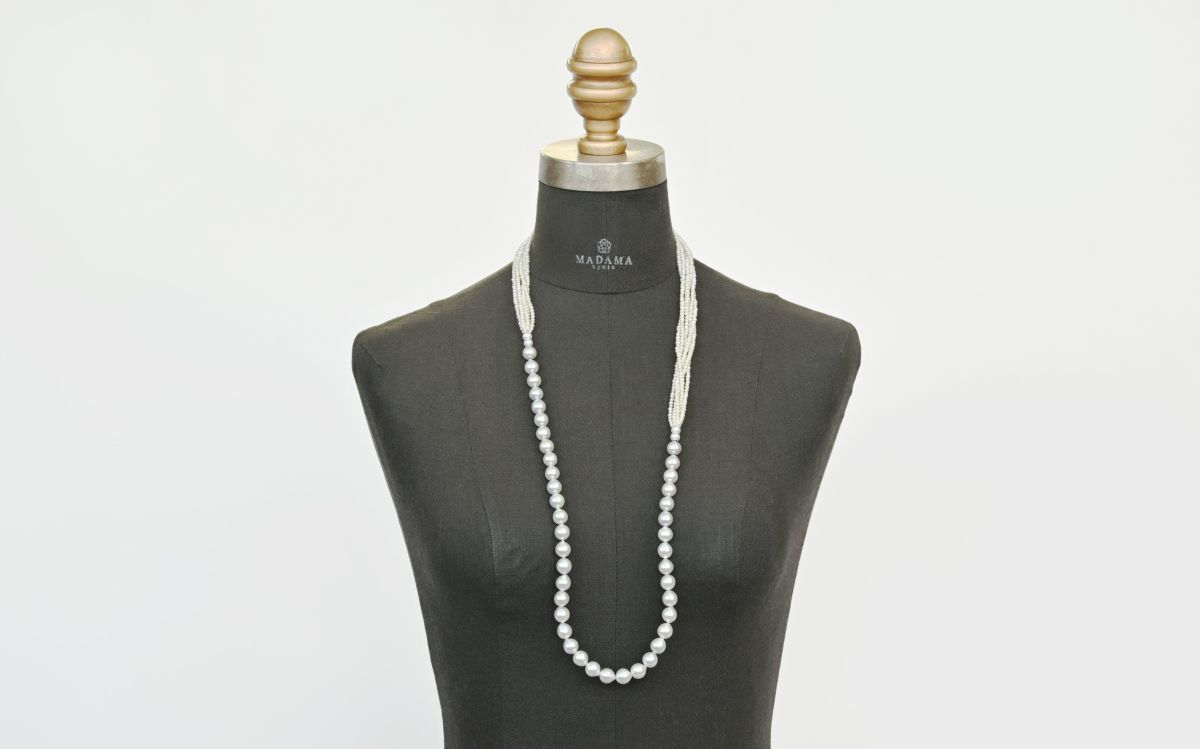 無調色真珠ならではの自然が育んだ美しいナチュラルグレーカラーで個性ある形が特徴的なバロックのアコヤパール40cmモジュールと淡水ケシパール6連40cmモジュールを合わせたロングネックレス。白とグレーのコントラストがアクセントになったデザインで、80cmの長さはそのまま被りでも使えて、どんなコーディネートにも合わせやすいアイテム。パールの中に埋め込まれた<MADAMA>オリジナルのクラスプは、回しながら差し込みねじると留められ、互いを押し合いねじると外れます。つなぎ目が見えず、どの角度からでもきれいにお着けいただけます。単品でもそれぞれネックレスとしてもお楽しみいただけます。淡水ケシ6連は2重にしてブレスレットにしてもボリューム感がアクセントに。