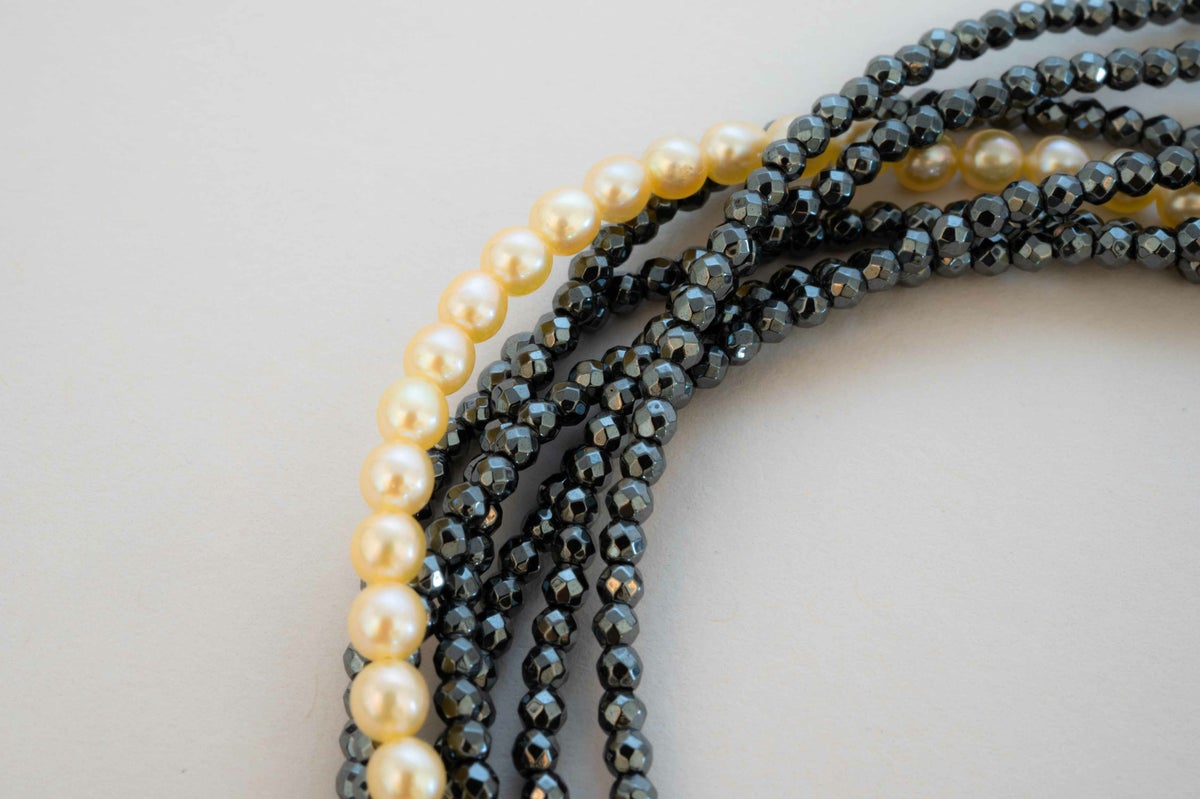 カットで煌めき豊かなヘマタイト6連に、無調色真珠ならではの希少なベビーサイズのクリームカラーのアコヤパールを1連あしらった、ボリューム感たっぷりのアンクレットとして使える25cmのモジュール。黒にゴールドの輝きがしっかりと映えるとても華やかなデザイン。パールの中に埋め込まれた<MADAMA>オリジナルのクラスプは、回しながら差し込みねじると留められ、互いを押し合いねじると外れます。つなぎ目が見えず、どの角度からでもきれいにお着けいただけます。単品ではもちろん、他のモジュールと組合わせてネックレスとしても使えます。パールの連のネックレスと合わせればこのモジュールがアクセントとなり、他にはないパールスタイリングをお楽しみいただけます。