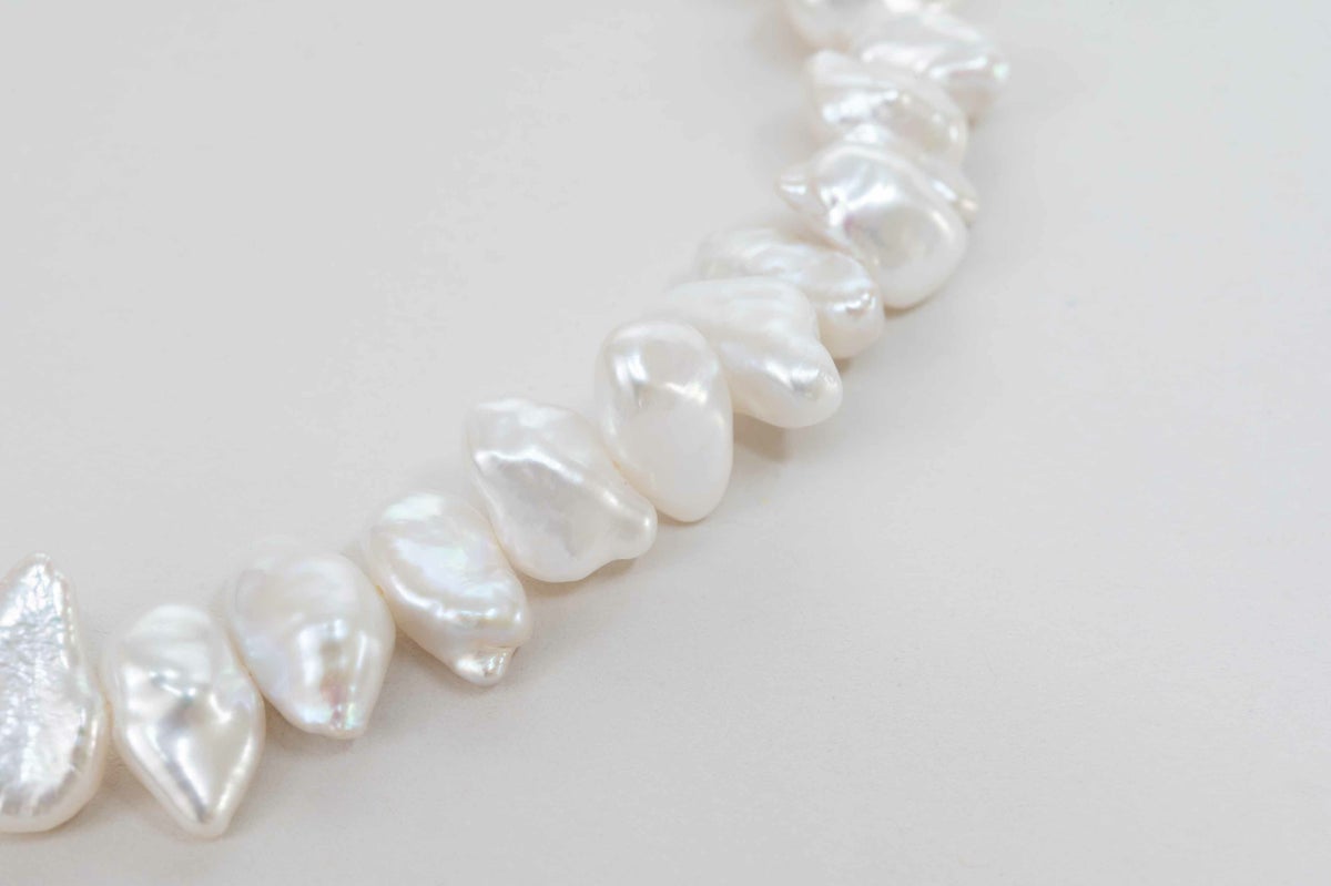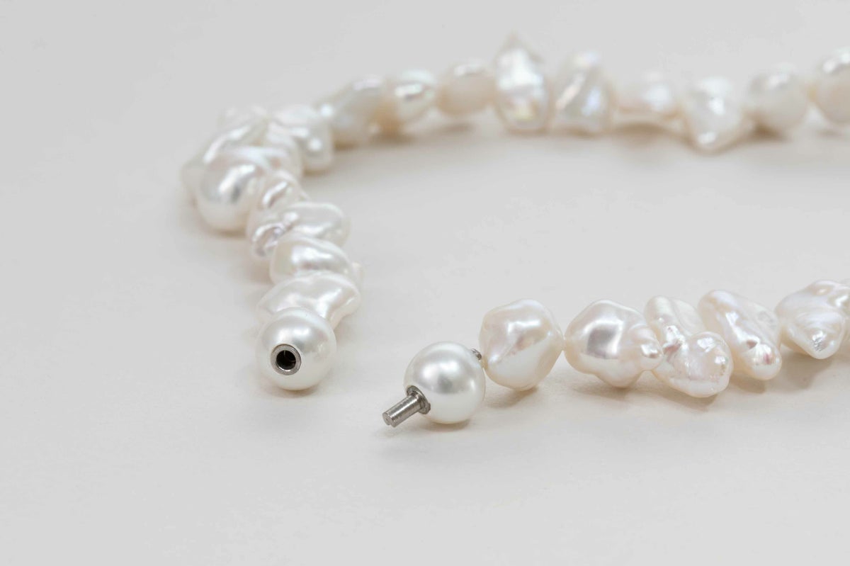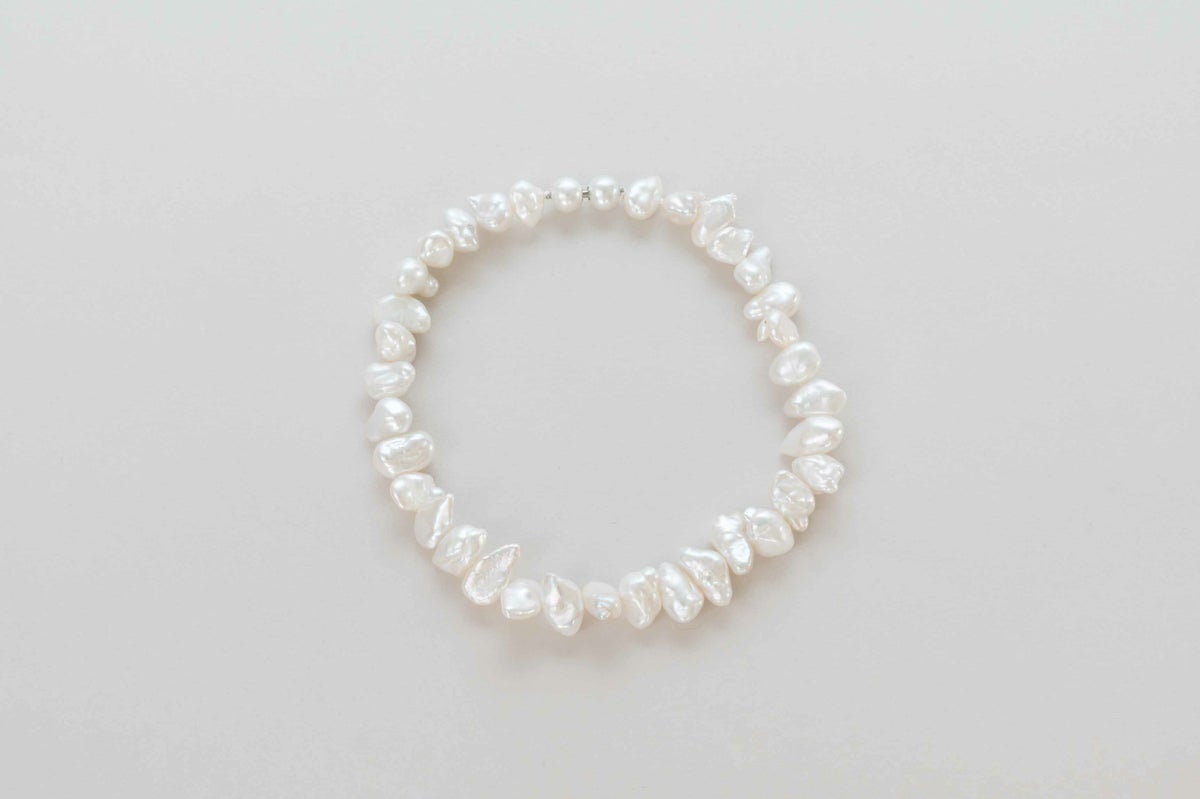 自然が育んだ個性的な形が魅力の淡水のバロックパール。よりいびつな形と強い照りが、丸い形の印象が強いパールのイメージとはまた違う魅力があります。大きすぎないサイズ感もカジュアルでも使いやすいアンクレットです。パールの中に埋め込まれた<MADAMA>オリジナルのクラスプは、回しながら差し込みねじると留められ、互いを押し合いねじると外れます。つなぎ目が見えず、どの角度からでもきれいにお着けいただけます。単品ではもちろん、他のモジュールと組合わせればネックレスとしてもお楽しみいただけます。