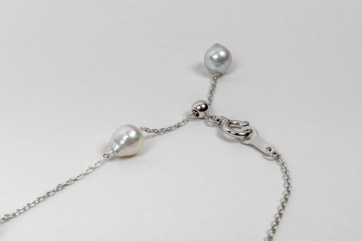 無調色真珠ならではの自然が育んだナチュラルグレーカラーのアコヤパール。4.5mmのバロックパールをK18WGの繊細なチェーンに散りばめたブレスレットは、シリコン入りボール部分で長さも調整できるので手首にきれいに沿える美しいラインを描きます。袖口のデザインや、重ね付けの際に細やかな長さ調整ができるのでとても便利です。ギフトにもサイズを気にせず贈れるのでおすすめです。