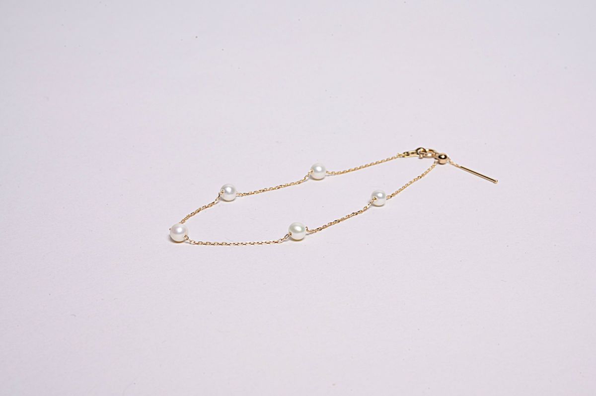 淡水パール4mmを繊細なあずきチェーンにあしらったブレスレット。ブレスレットとしては珍しくチェーン部分はピンスライドタイプで長さを自由に調整できます。自分のサイズに合った長さはもちろん、重ね付けなどによっての細かな調整も可能です。