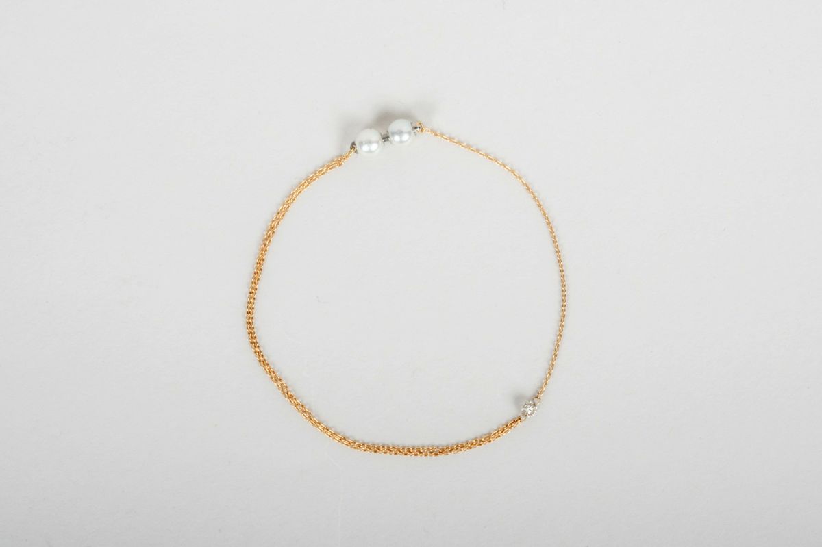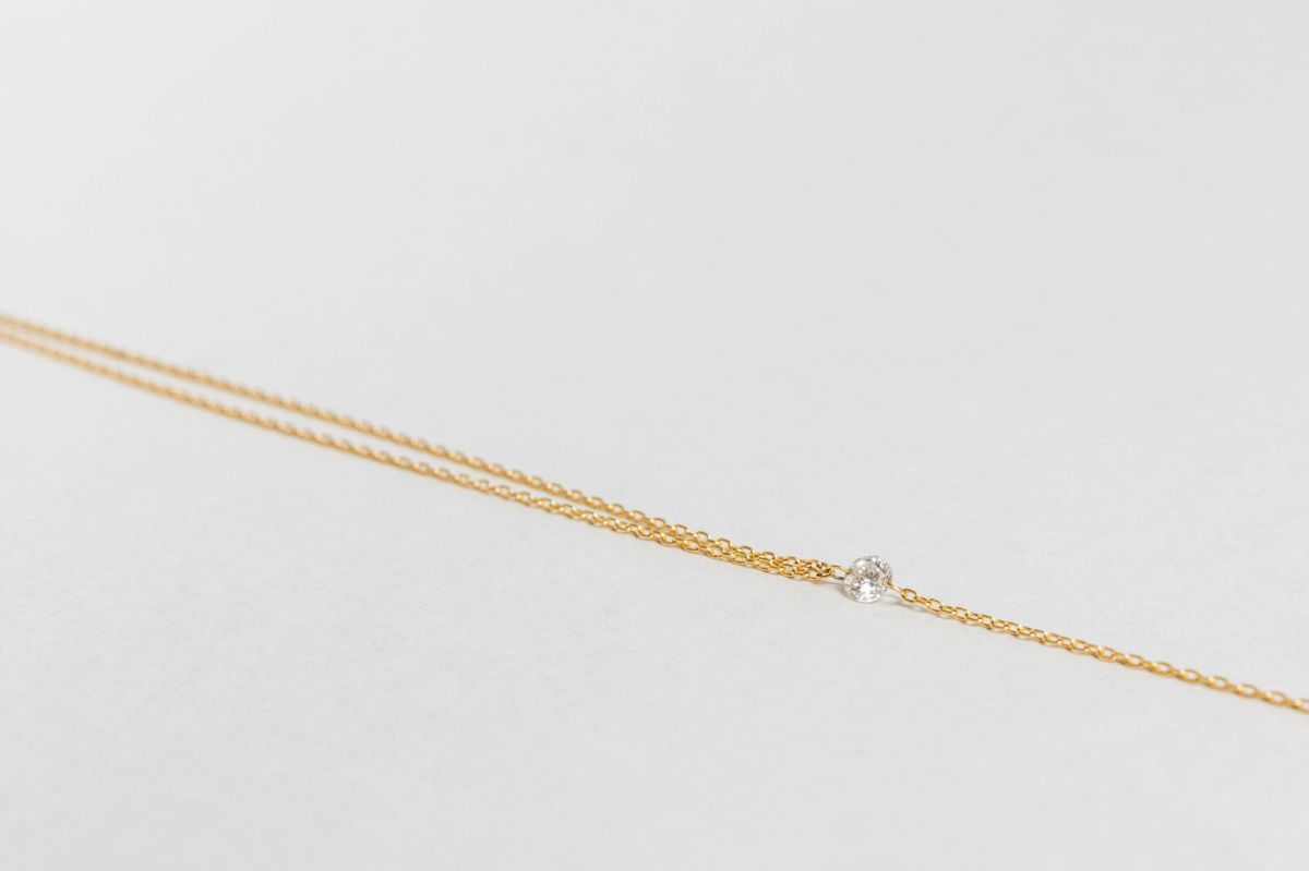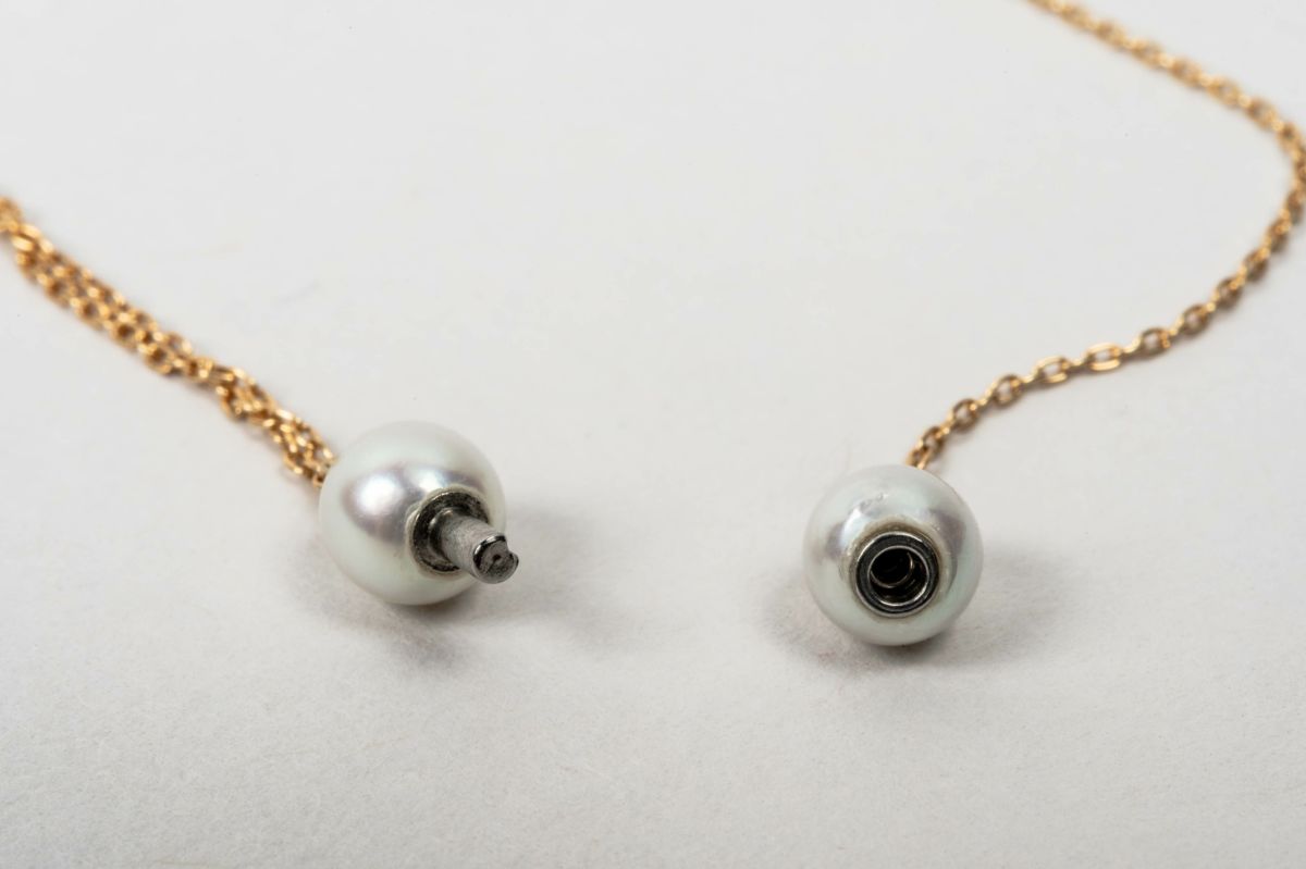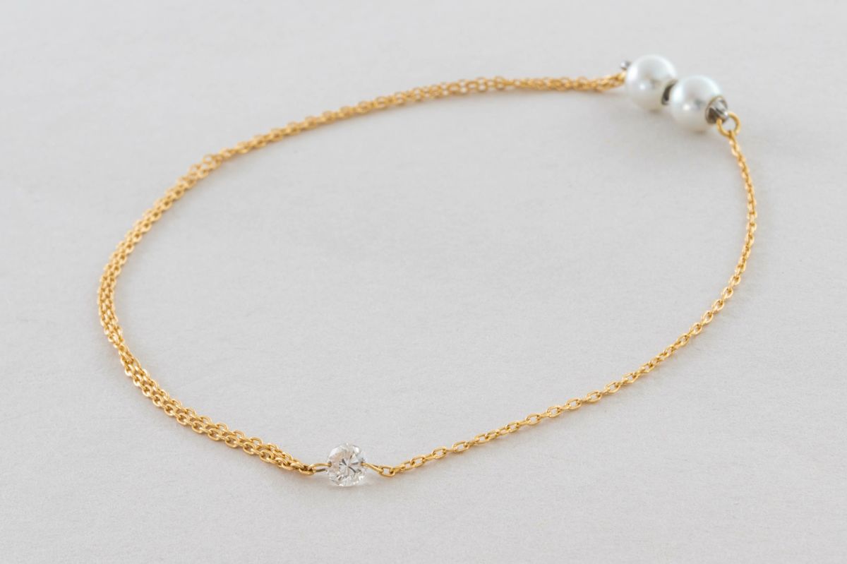 余計なデザインをそぎ落としたシンプルなブレスレット。繊細なチェーンに小さなダイヤモンドで輝きをプラス。1連と2連とでチェーンのボリュームにアクセントをつけたデザインでパールの連のブレスレットと重ね付けしても素敵です。パールの中に埋め込まれた<MADAMA>オリジナルのクラスプは、回しながら差し込みねじると留められ、互いを押し合いねじると外れます。つなぎ目が見えず、どの角度からでもきれいにお着けいただけます。単品ではもちろん、他のモジュールと合わせればネックレスとしても使えます。チェーンとパールの異素材の組み合わせで他にはないパールスタイリングをお楽しみください。