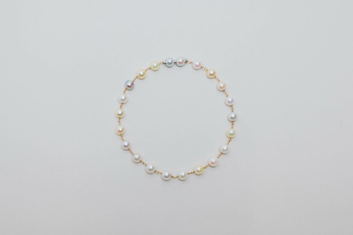 自然が育んだ美しい色味が堪能できるアコヤパールのマルチカラーを、細やかな作業で1粒1粒つなぎステーションにしたブレスレット。繊細なチェーンに留めるよりもしっかりとした存在感がでるようにしたデザインは、手首を華やかに演出します。ホワイト、クリーム、ナチュラルグレーと様々な色味をバランスよくソーティングすることで、それぞれの色の個性を際立たせます。パールの中に埋め込まれた<MADAMA>オリジナルのクラスプは、回しながら差し込みねじると留められ、互いを押し合いねじると外れます。つなぎ目が見えず、どの角度からでもきれいにお着けいただけます。単品ではもちろん、他のモジュールと合わせればネックレスとしても使えます。白のイメージが強い真珠とはまた違った新たな雰囲気をお楽しみください。