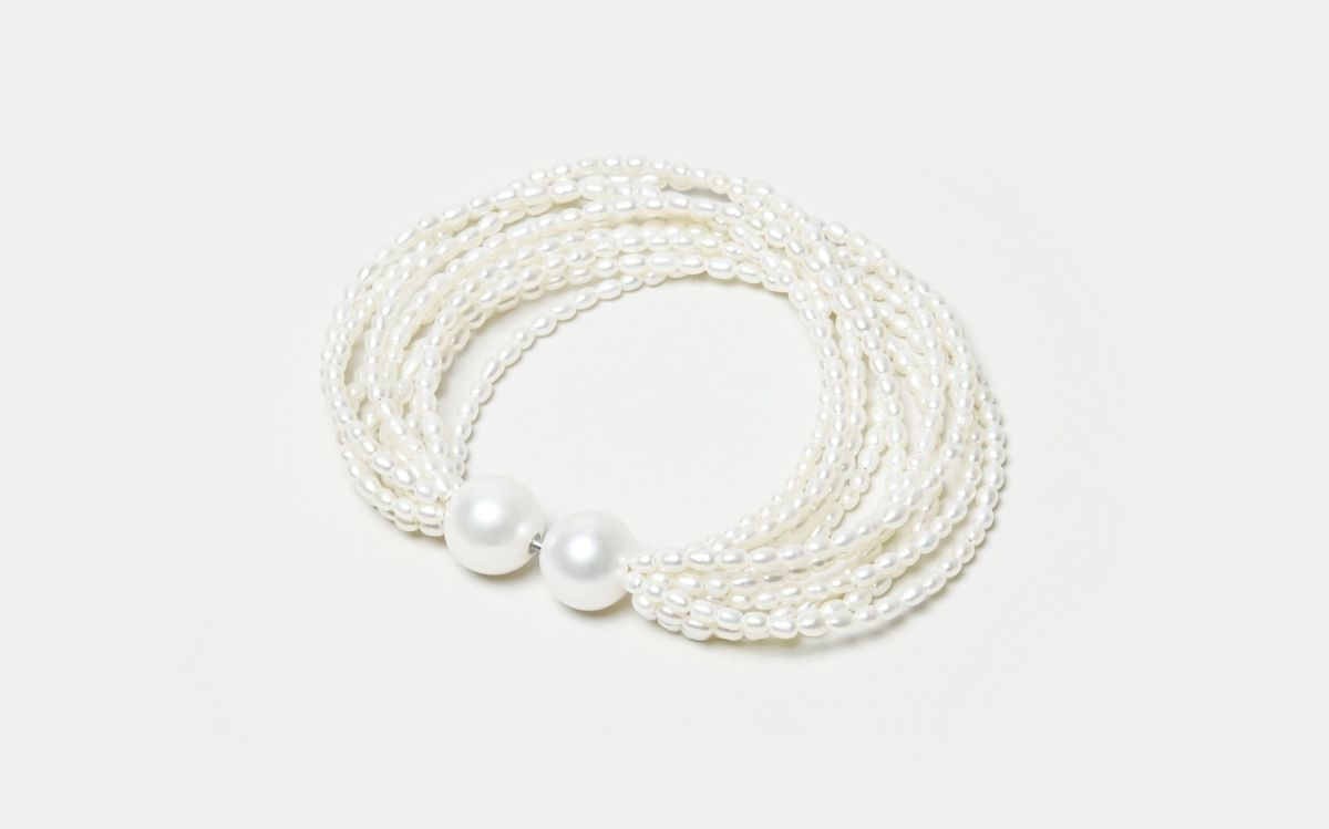 ケシの中でもさらに細かい砂ケシを使った淡水パール10連のブレスレット。自然が育んだ形はラウンドとはまた違った印象で、カジュアルにも合わせやすいデザインです。10連のボリューム感で手元を華やかに演出します。パールの中に埋め込まれた<MADAMA>オリジナルのクラスプは、回しながら差し込みねじると留められ、互いを押し合いねじると外れます。つなぎ目が見えず、どの角度からでもきれいにお着けいただけます。他のモジュールと合わせればネックレスとしてもお楽しみいただけます。