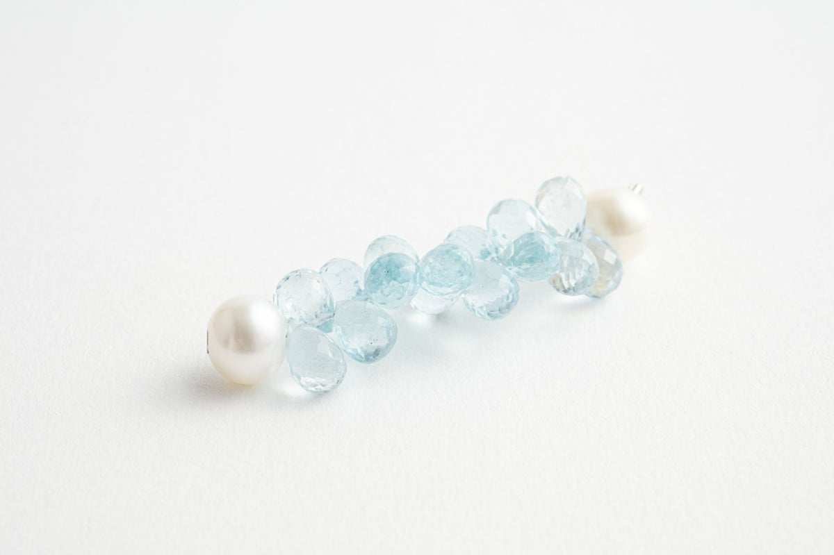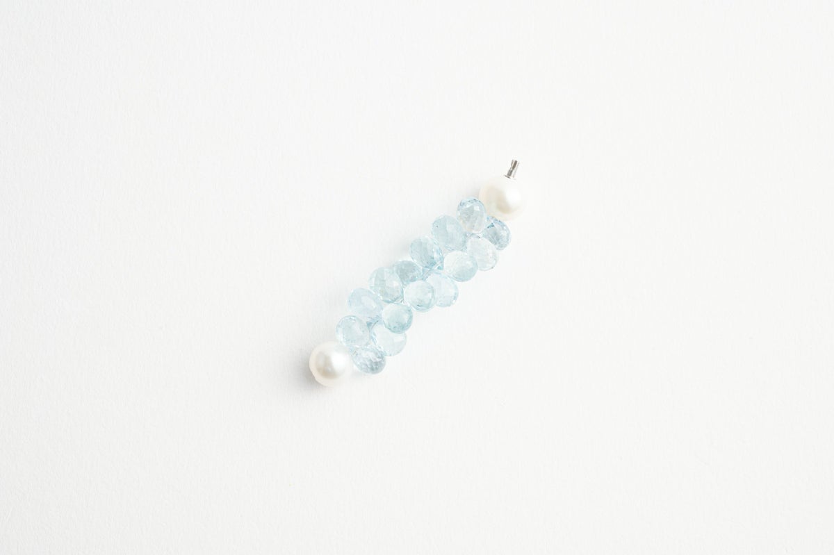 MADAMAで人気のカラーストーンシリーズ。今回新たにクリアなアクアマリンのショートモジュールが登場。ドロップ型のアクアマリンを房の様に仕立てたショートモジュールは、石に細かなカットが入っているので光が当たるとしっかりと輝き、クリアなブルーの透明感をより一層引き立てます。パールの中に埋め込まれた<MADAMA>オリジナルのクラスプは、回しながら差し込みねじると留められ、互いを押し合いねじると外れます。つなぎ目が見えず、どの角度からでもきれいにお着けいただけます。他のモジュールと合わせればパールにアクセントを加えたデザインネックレスとしてお楽しみいただけます。