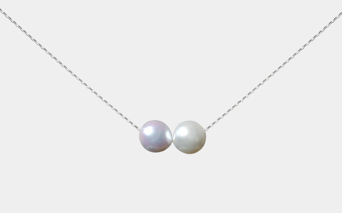 無調色真珠ならではの自然が育んだ美しいナチュラルグレーカラーのアコヤバロックパールとホワイトのバロックパールを2珠通したスルールースネックレス。チェーンはピンスライドタイプで長さを自由に調整できます。スルールースを取り外すこともできるので、その日の気分でそれぞれの色味の1珠ネックレスとしてもお楽しみいただけます。