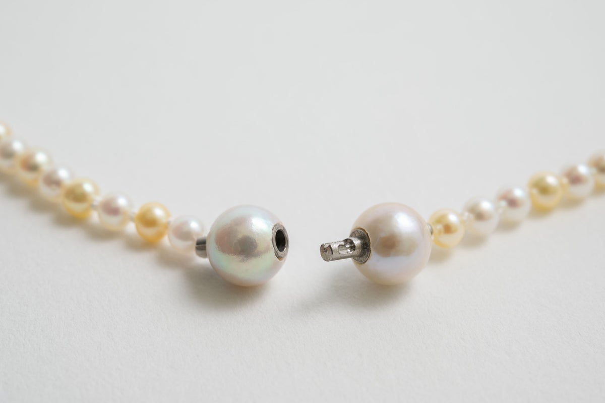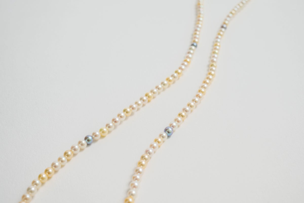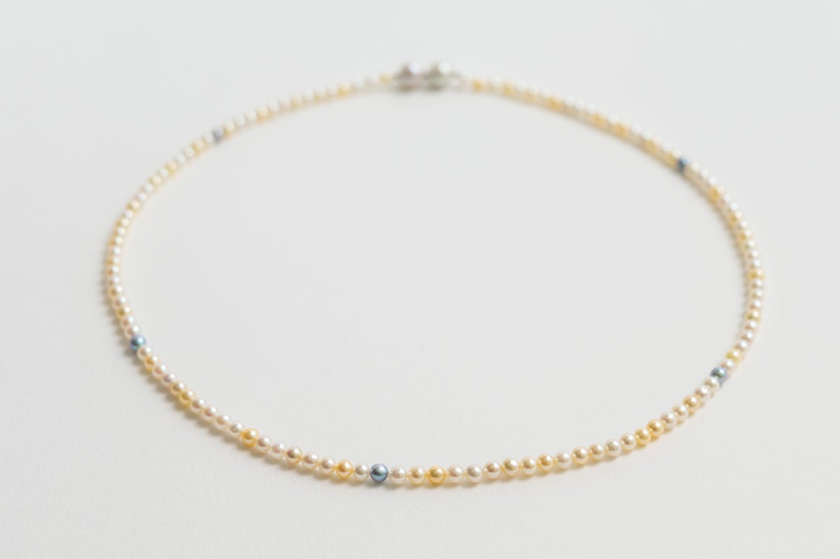 無調色真珠ならではの自然が育んだ美しいホワイト、クリーム、ナチュラルグレーカラーの色味を堪能できるアコヤパールのマルチカラー3mmのパールネックレス。色のバランスを考えたソーティングと、アコヤパールの中でも希少な3mmというサイズ感が唯一無二のアイテムになります。珠のサイズは小さくてもアコヤパールならではの照りは堪能できる贅沢なネックレスはどんなシーンにもお使いいただけます。チェーンネックレスなど他のネックレスとの重ね付けも素敵です。パールの中に埋め込まれた<MADAMA>オリジナルのクラスプは、回しながら差し込みねじると留められ、互いを押し合いねじると外れます。つなぎ目が見えず、どの角度からでもきれいにお着けいただけます。他のモジュールと合わせればロングネックレスとしてもお楽しみいただけます。