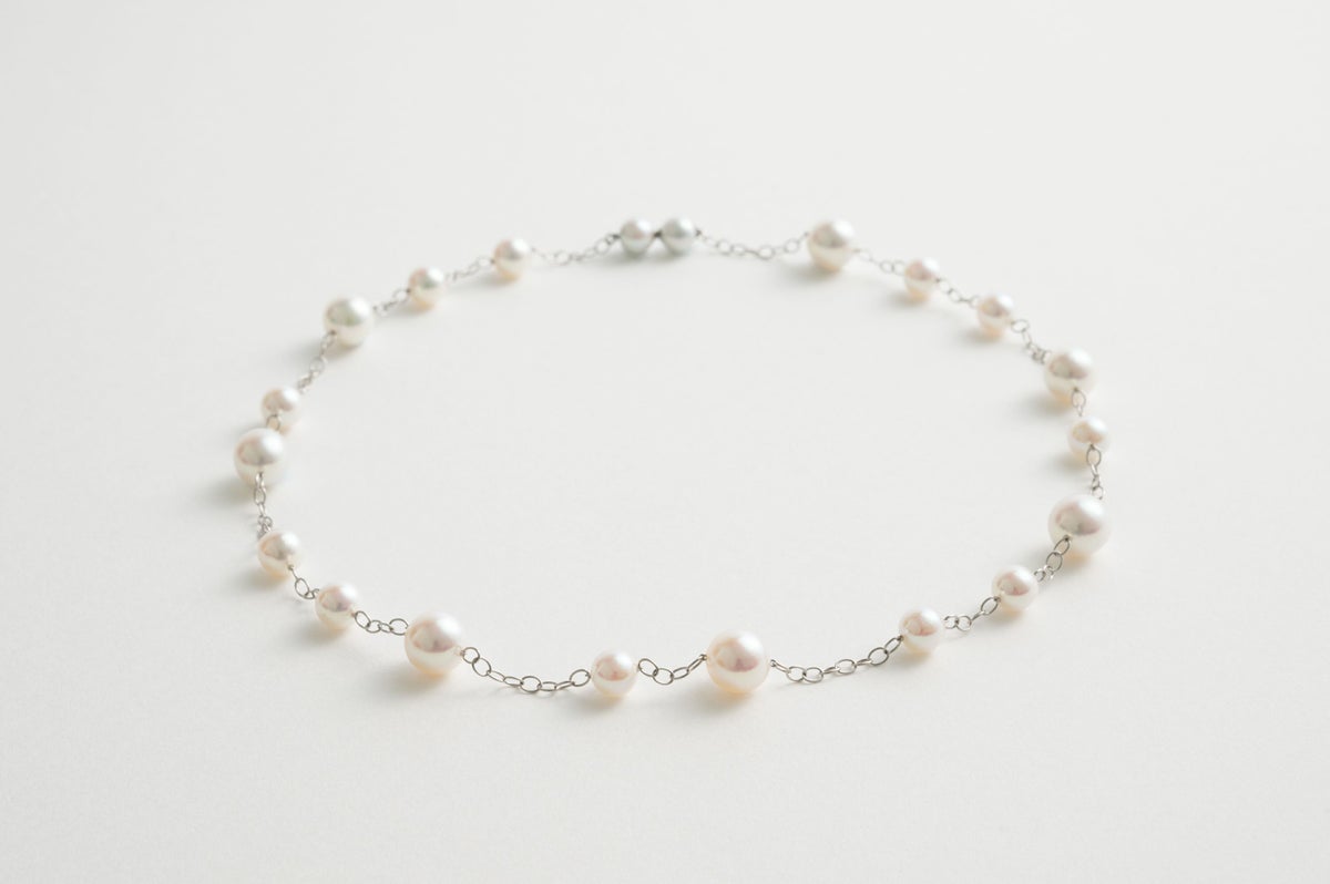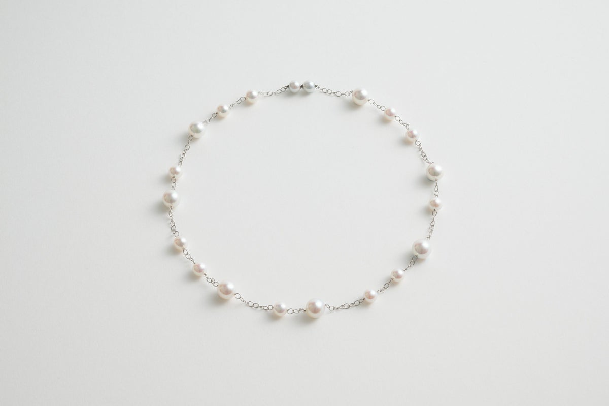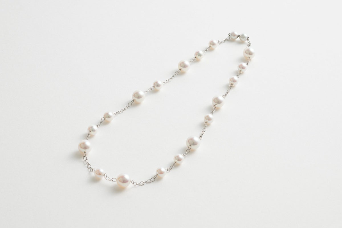 無調色真珠ならではの自然が育んだ色味と美しい照りが堪能できるアコヤパールをフープ状の特徴的なチェーンに散りばめたステーションデザインネックレス。6mmと8mmのサイズの違うアコヤパールをランダムにすることで立体感を生み出し、軽やかでありながら存在感ある首元を演出します。パールの中に埋め込まれた<MADAMA>オリジナルのクラスプは、回しながら差し込みねじると留められ、互いを押し合いねじると外れます。つなぎ目が見えず、どの角度からでもきれいにお着けいただけます。他のモジュールと合わせればロングネックレスとしてもお楽しみいただけます。ぜひ他にないパールスタイリングをご堪能ください。