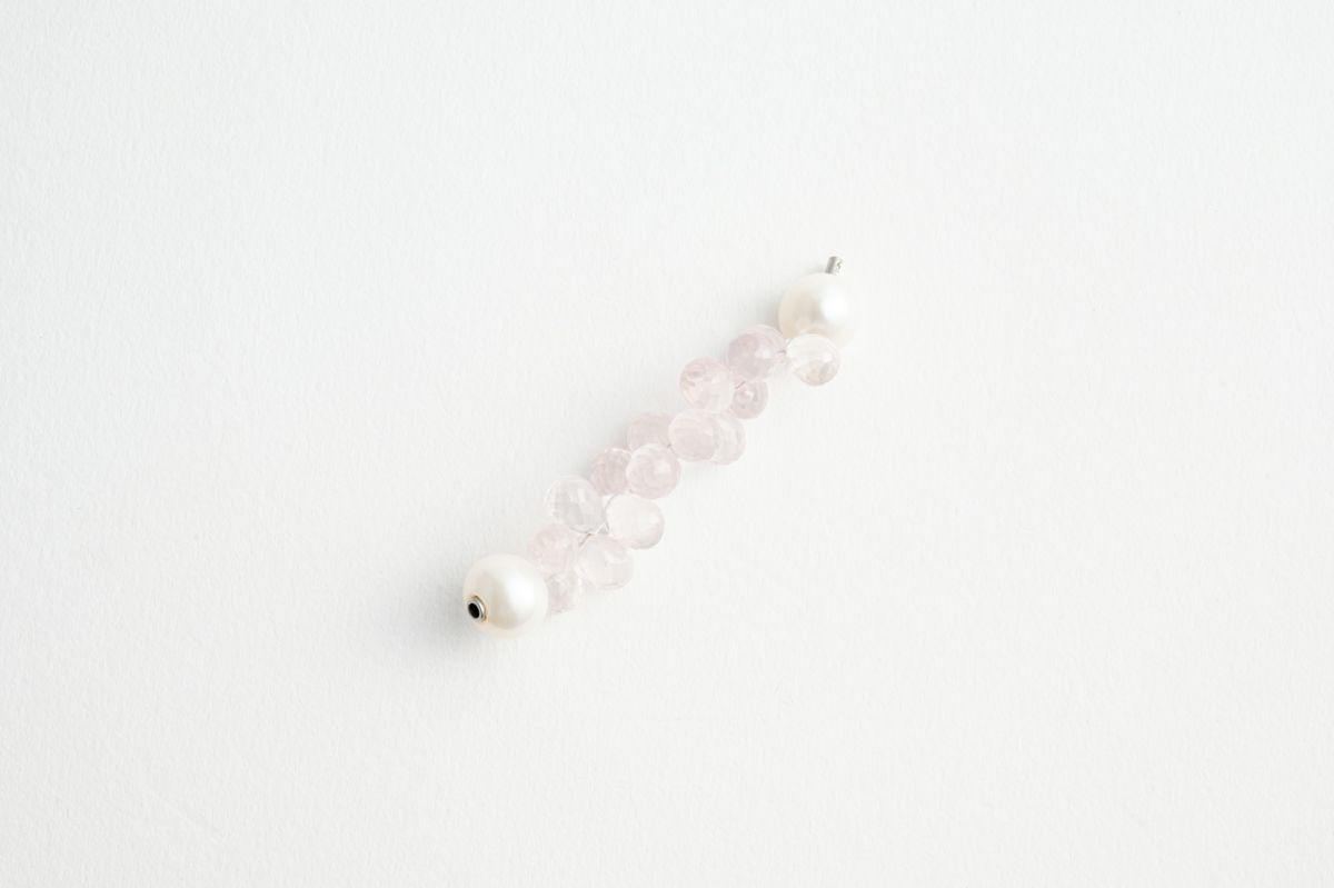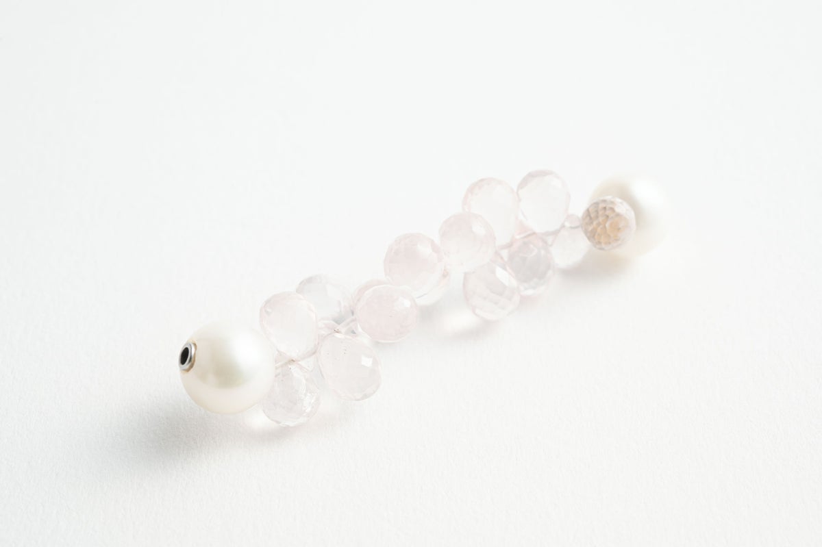 MADAMAで人気のカラーストーンシリーズ。今回新たにクリアなローズクォーツのショートモジュールが登場。ドロップ型のローズクォーツを房の様に仕立てたショートモジュールは、石に細かなカットが入っているので光が当たるとしっかりと輝き、クリアなピンクの透明感をより一層引き立てます。パールの中に埋め込まれた<MADAMA>オリジナルのクラスプは、回しながら差し込みねじると留められ、互いを押し合いねじると外れます。つなぎ目が見えず、どの角度からでもきれいにお着けいただけます。他のモジュールと合わせればパールにアクセントを加えたデザインネックレスとしてお楽しみいただけます。