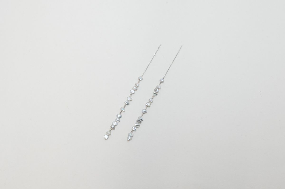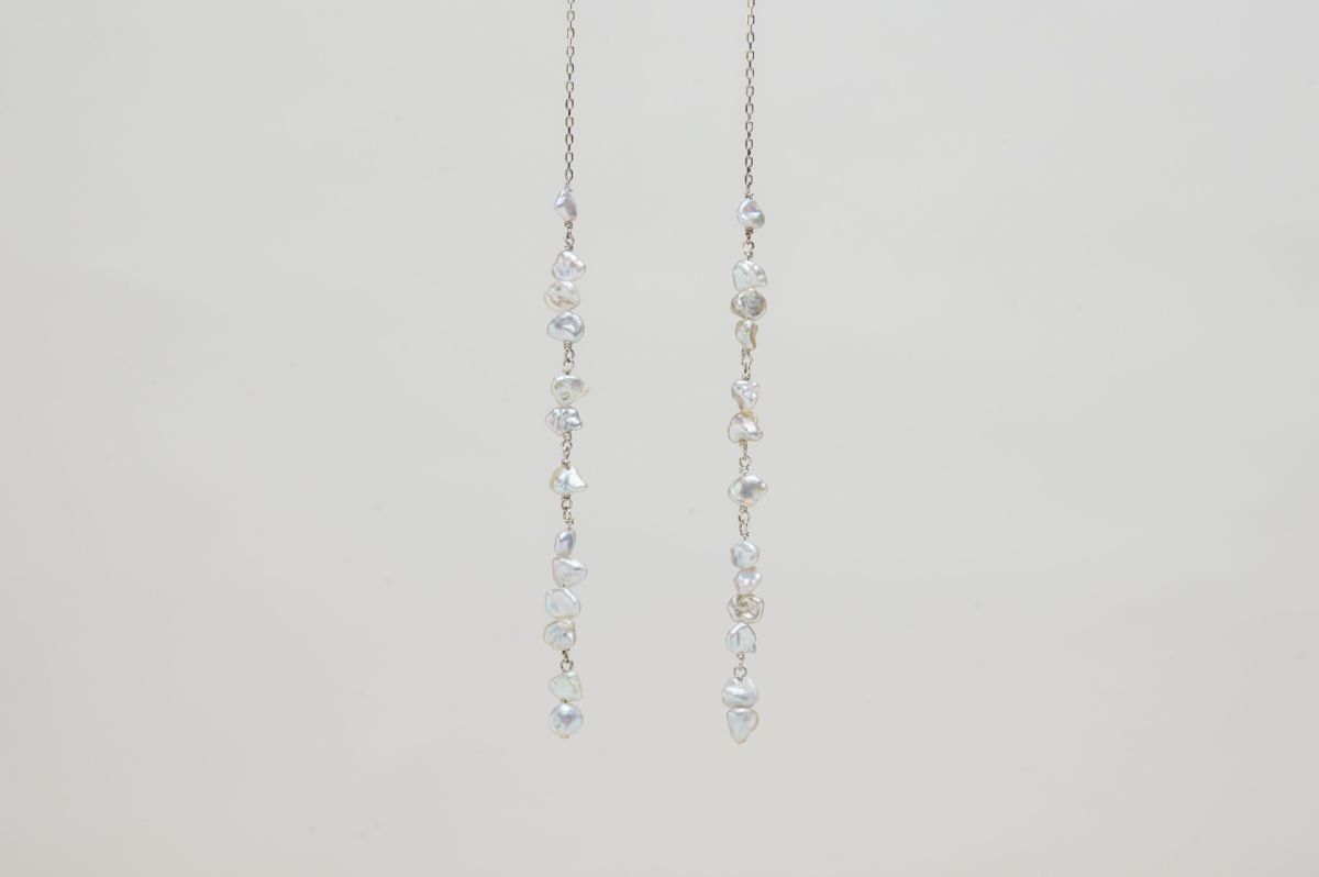 希少なアコヤケシパール。自然が育んだ美しいナチュラルグレーの色味と2つと同じものが存在しない形は、他にはない個性になります。その個性豊かな珠を散りばめたデザインのアメリカンピアスで、K18のホワイトゴールドのカラーとアコヤケシのナチュラルグレーがワントーンにまとまります。長さもチェーン部分は自由に調整できるのでその日のスタイリング合わせてお楽しみください。