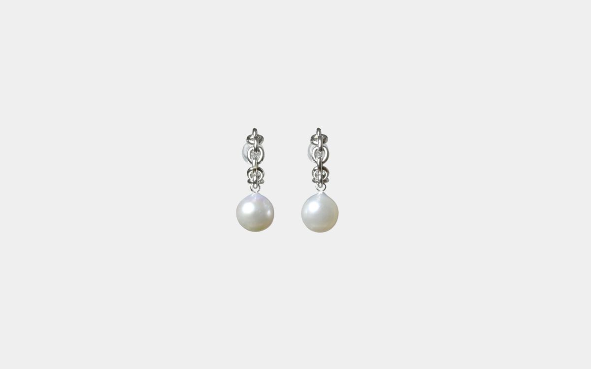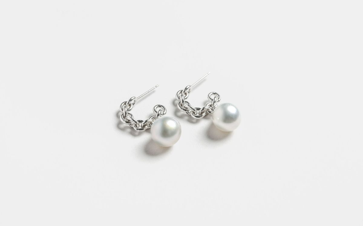 チェーンをフープ状にしたモチーフに自然が生み出したアコヤのナチュラルグレーカラーのバロックを垂らしたデザインのピアス。無調色真珠ならではのナチュラルグレーの色味は白とはまた違った印象を与えバロックパールが存在感あるデザインで顔周りを華やかに。