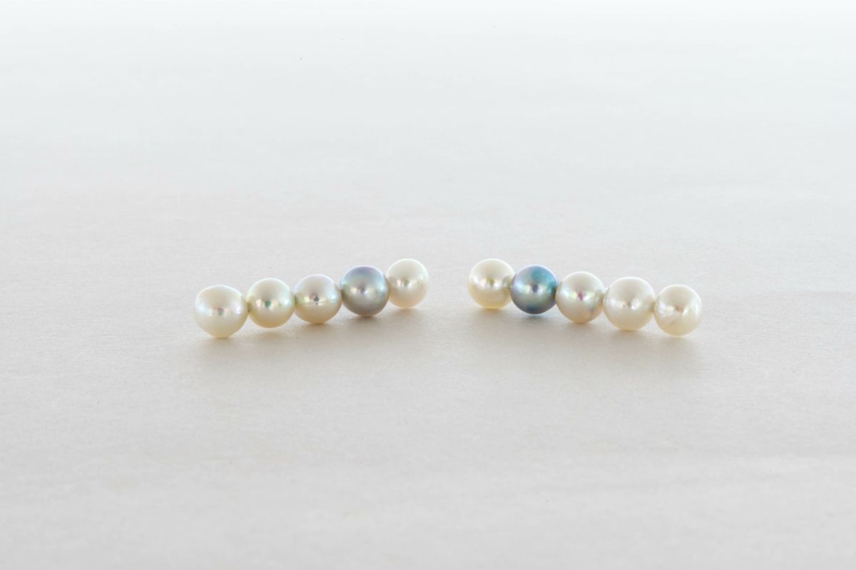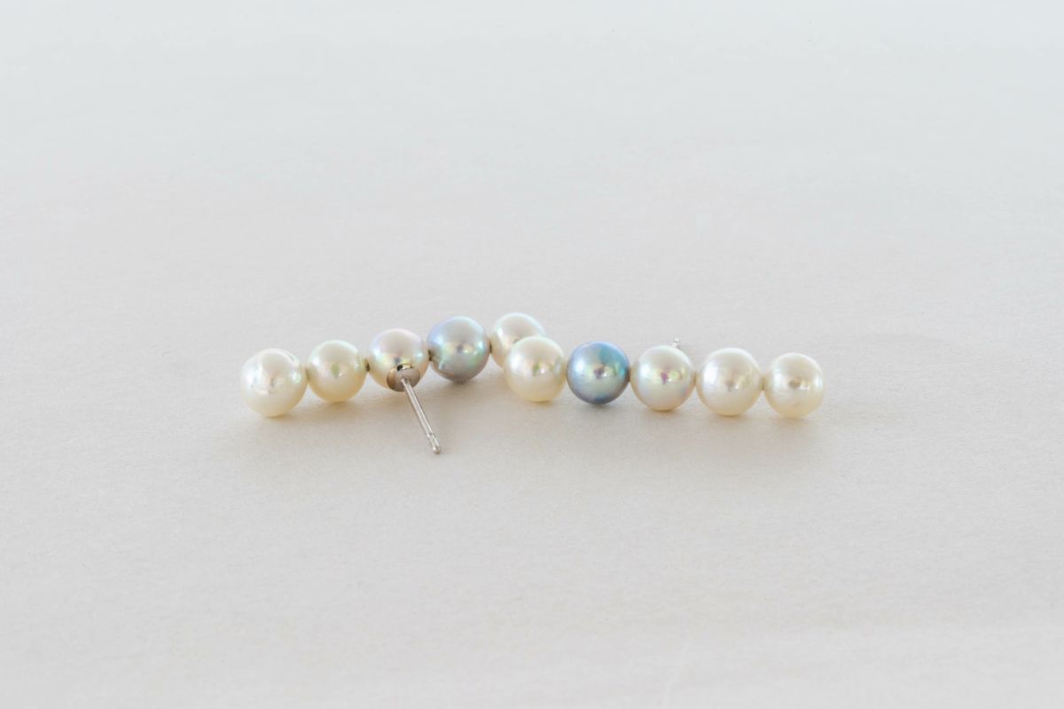 無調色真珠ならではの自然が育んだナチュラルグレーカラーのアコヤパール。5mmのバロックパールで色味の個性を感じられるよう白からグレーまでのマルチカラーでデザイン。5珠をバーにしているので存在感抜群で、着ける角度によっても印象を変えられます。片耳だけやアシンメトリーな着け方などいろいろなコーディネートでお楽しみください。