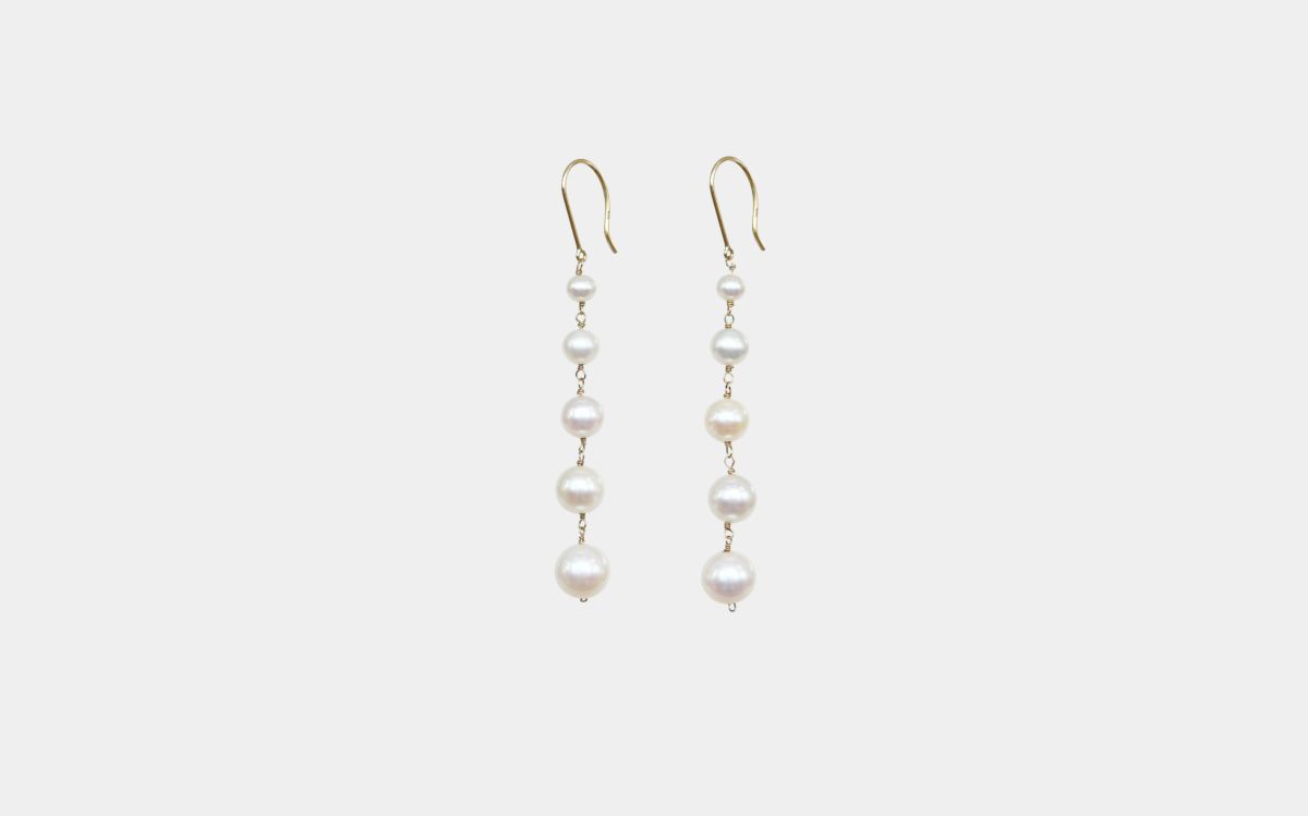 淡水パールをグラデーションにデザインしたフックピアス。下に向かって大きいサイズになるグラデーションは、ボリュームがありながら軽やかな仕上がりに。パーティシーンからカジュアルまで、合わせやすい1点です。