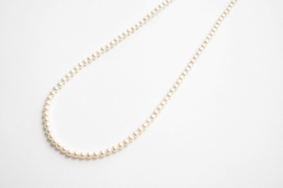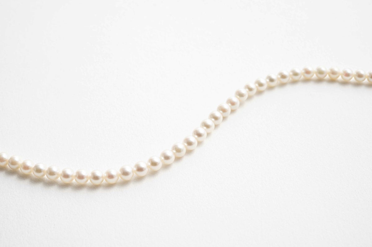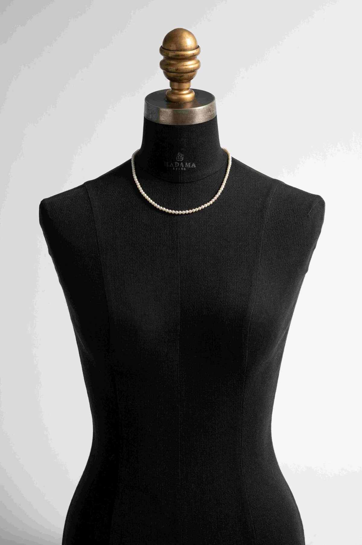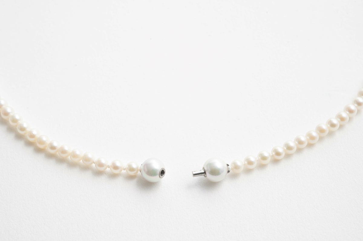 無調色真珠ならではの自然が育んだ美しい色味をい堪能できる希少なアコヤベビーパールネックレス。白の中にも表情のある色味を楽しめます。珠のサイズは小さくてもアコヤパールならではの照りを堪能できる贅沢なネックレスはどんなシーンにもお使いいただけます。チェーンネックレスなど他のネックレスとの重ね付けも素敵です。パールの中に埋め込まれた<MADAMA>オリジナルのクラスプは、回しながら差し込みねじると留められ、互いを押し合いねじると外れます。つなぎ目が見えず、どの角度からでもきれいにお着けいただけます。他のモジュールと合わせればロングネックレスとしてもお楽しみいただけます。