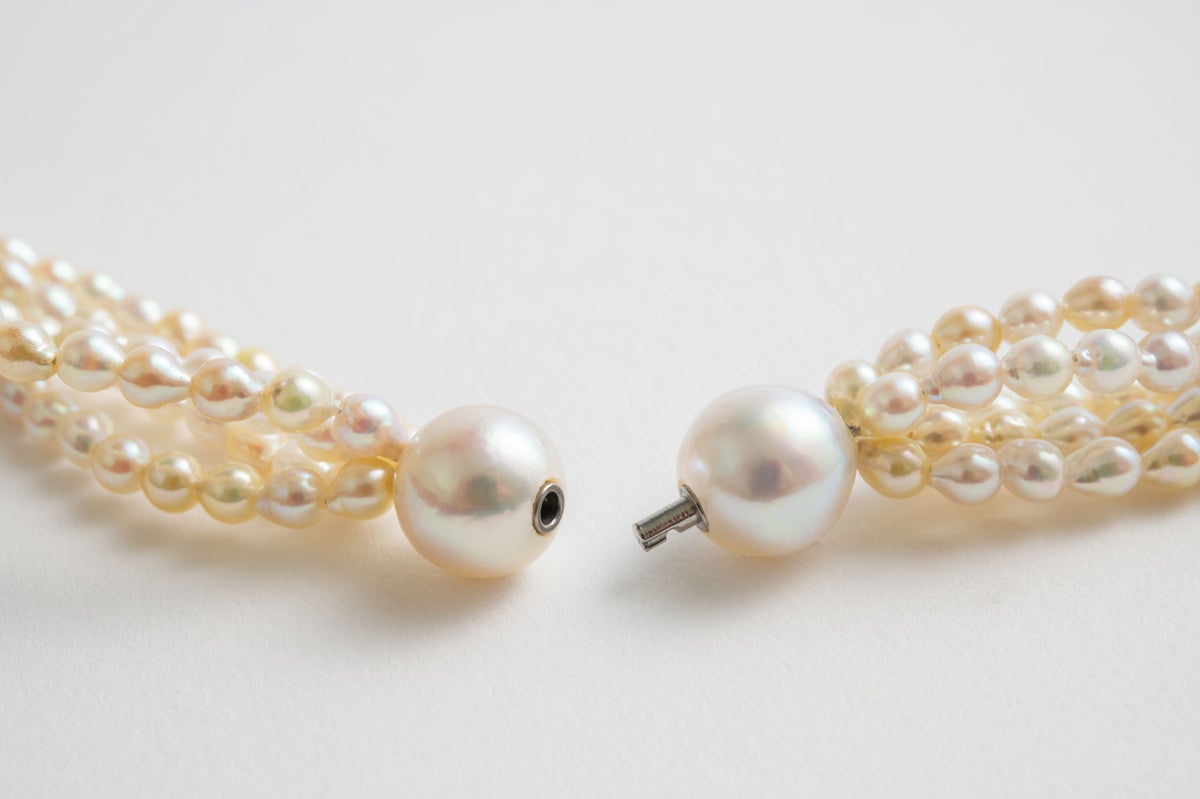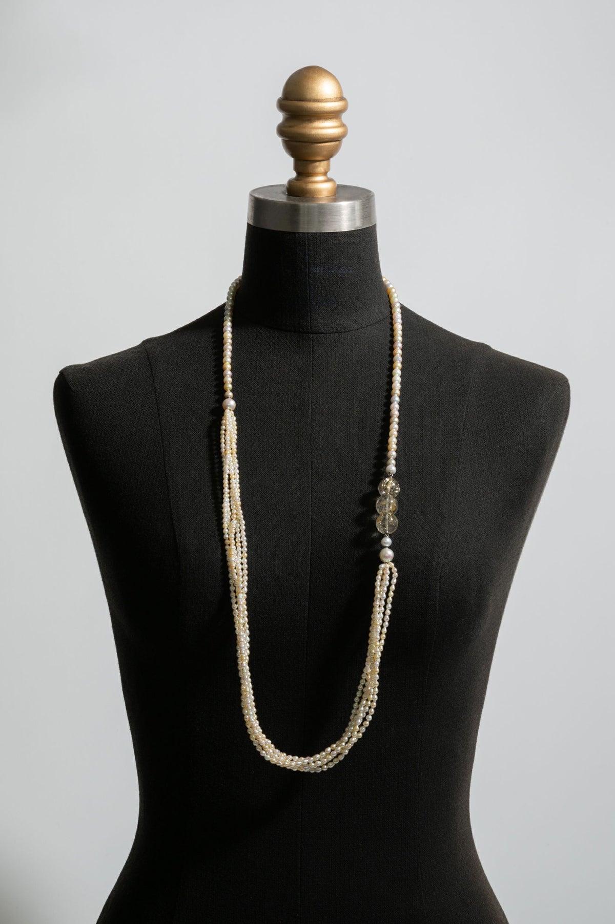 無調色真珠ならではの自然が育んだ美しいホワイト、クリーム、ナチュラルグレーカラーの色味を堪能できるアコヤパールのマルチカラーコレクションを贅沢に使ったロングネックレス。ネックレスは色のバランスを考えたソーティングにより他にはない存在感の希少なアイテムで、程よいサイズで使いやすい5-6mmのラウンドのネックレスと、自然が育んだ個性豊かな形が特徴的なバロックの3mmを5連にした贅沢なネックレスを組み合わせました。ポイントは透明感が美しいルチルのショートモジュールを合わせてデザイン性をプラス。カラーストーンとパールの異素材がお互いの良さを際立たせててくれます。パールの中に埋め込まれた<MADAMA>オリジナルのクラスプは、回しながら差し込みねじると留められ、互いを押し合いねじると外れます。つなぎ目が見えず、どの角度からでもきれいにお着けいただけます。単品でそれぞれネックレスとしても使えて、ルチルをアクセントに合わせても素敵です。他のモジュールと合わせれば自分だけの様々なデザインをお楽しみいただけます。