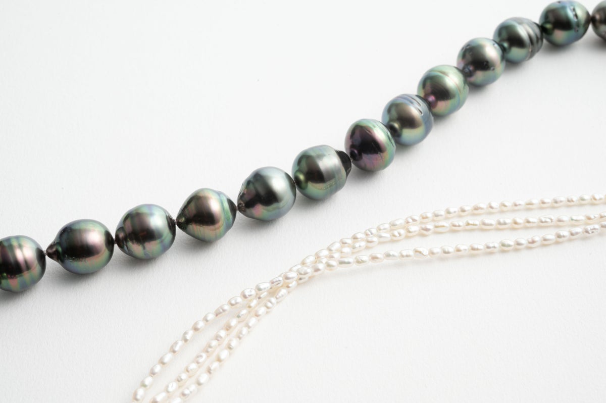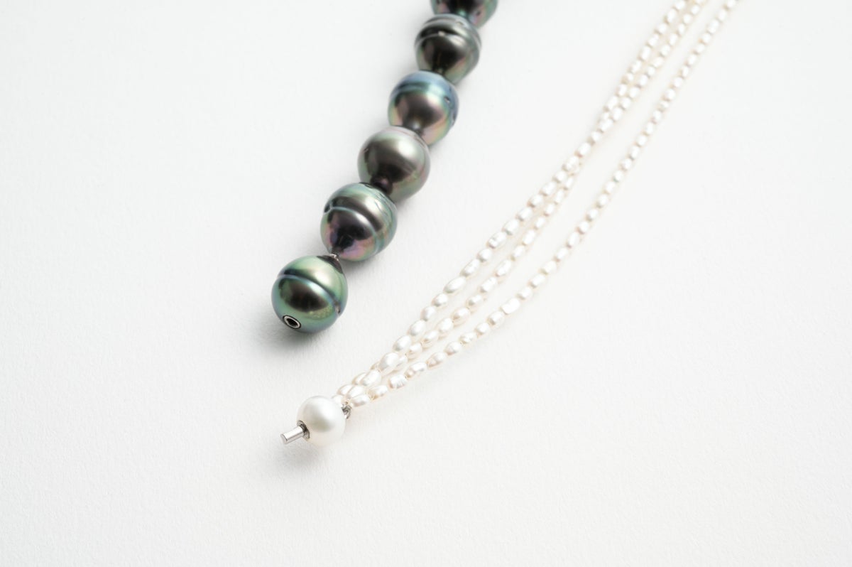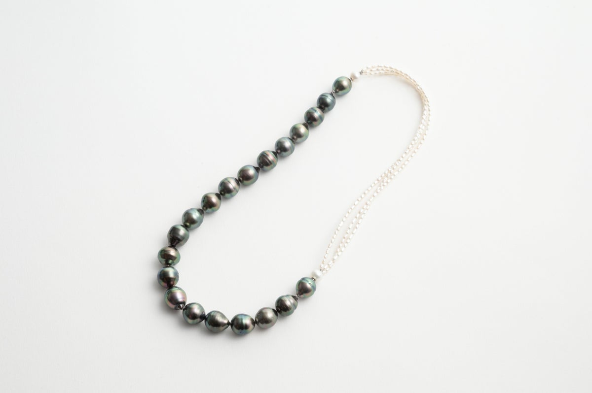 無調色真珠ならではの自然が育んだ美しい色味を堪能できる黒蝶パール。個性豊かなバロックの形に淡水の砂ケシ3連のモジュールを合わせたデザインネックレス。ブラックとホワイト、バロックとケシのコントラストがお互いを際立ててくれます。着ける位置によって雰囲気を変えられます。パールの中に埋め込まれた<MADAMA>オリジナルのクラスプは、回しながら差し込みねじると留められ、互いを押し合いねじると外れます。つなぎ目が見えず、どの角度からでもきれいにお着けいただけます。黒蝶パールは1本で25cmなのでアンクレットに。合わせた淡水ケシパールは単品でブレスレットとしてもお使いいただけます。自分だけのパールスタイリングをお楽しみください。