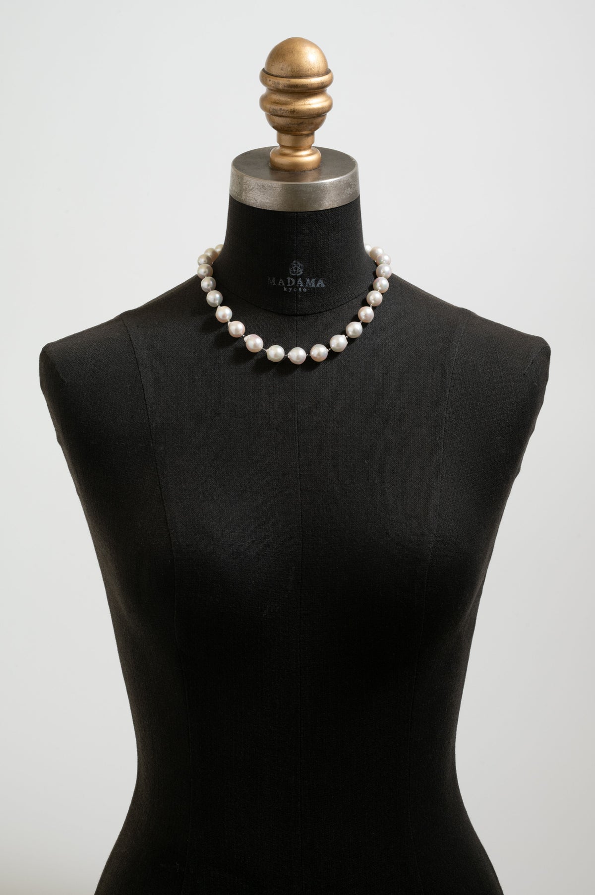 パールの中に埋め込まれた<MADAMA>オリジナルのクラスプは、回しながら差し込みねじると留められ、互いを押し合いねじると外れます。つなぎ目が見えず、どの角度からでもきれいにお着けいただけます。