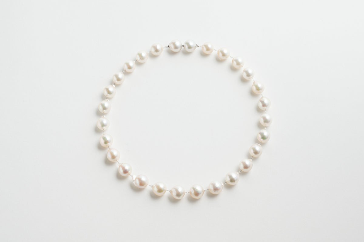 無調色真珠ならではの自然が育んだ色味と美しい照りが堪能できるアコヤパールネックレス。