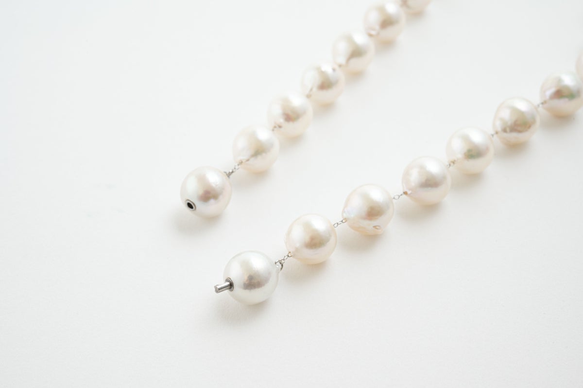 アコヤ真珠の大きさとしては最大級となる10-10.5mmのサイズのバロックパールをサージカルステンレスチェーンに散りばめたステーションデザインになります。