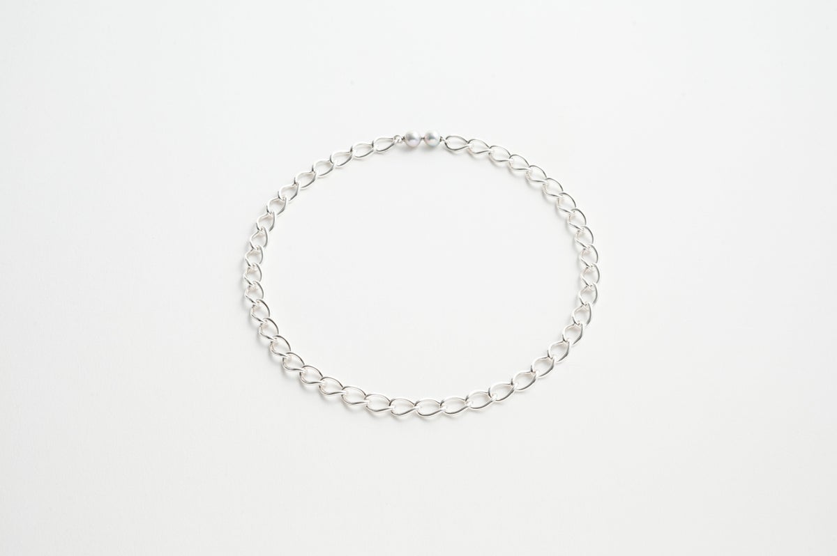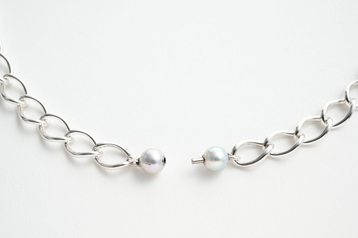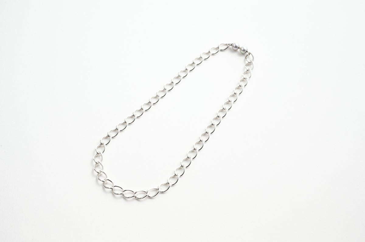 人気のシルバーチェーンのモジュールコレクション。緩やかな捻じれが印象的でしっかりとしたボリューム感のあるチェーンネックレスです。単品ではクラスプ部分のパールをアクセントとして着けていただくのも素敵です。どんなパールに合わせてもパールに負けずより際立ててくれるので、パールモジュールと合わせてロングネックレスとして自分だけのデザインをお楽しみいただけます。