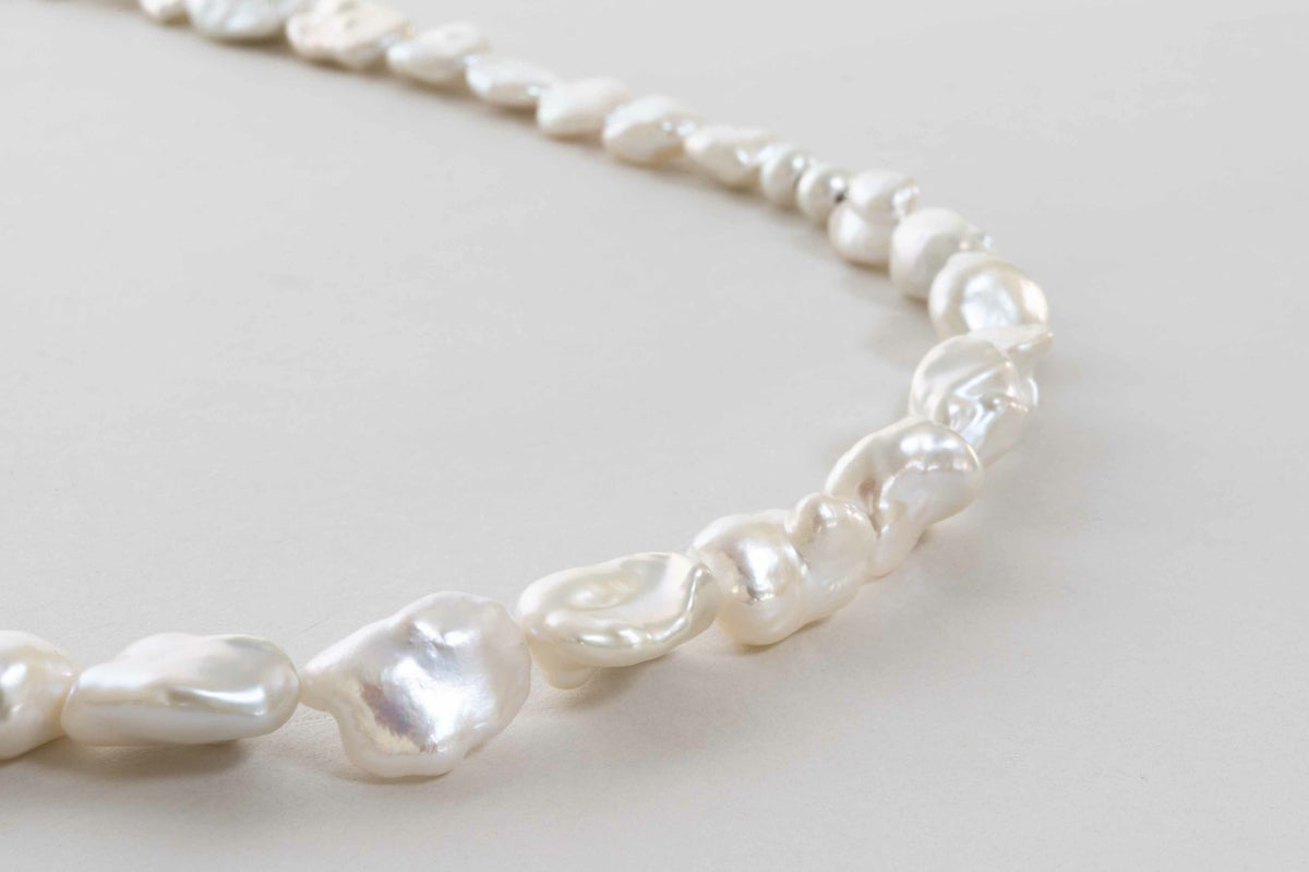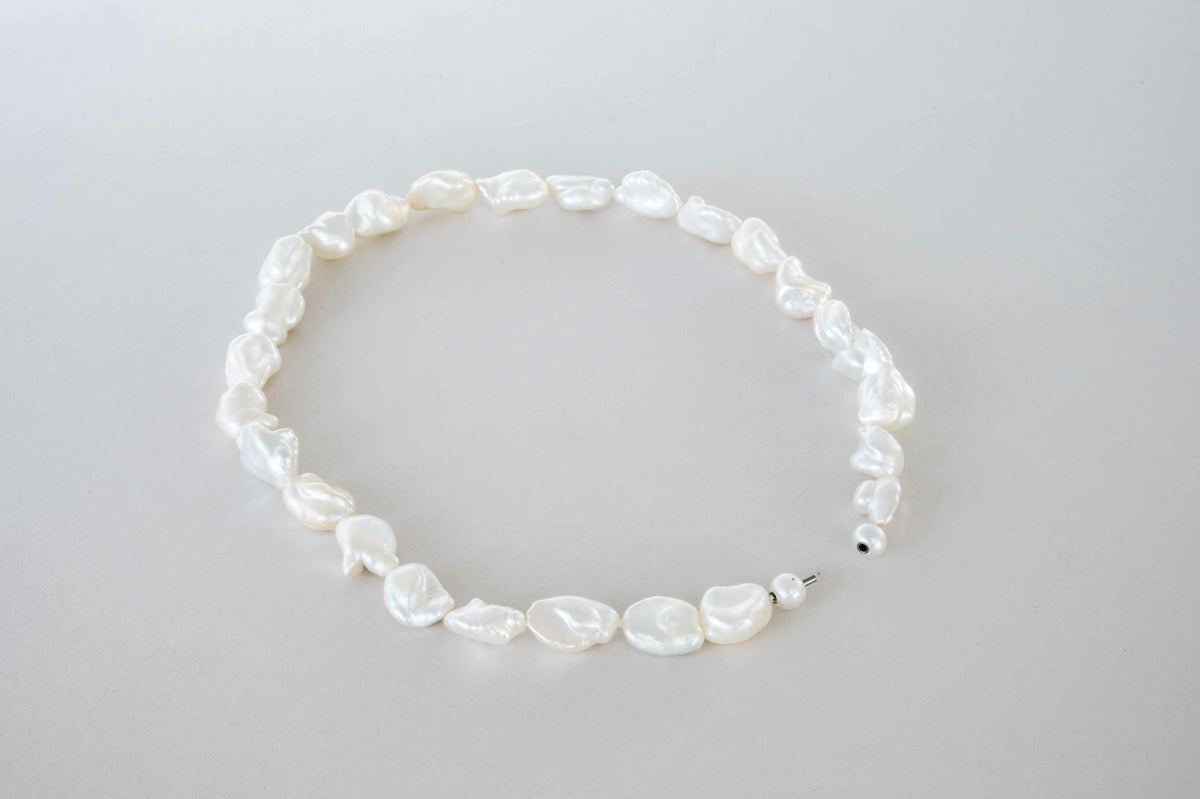ボリューム感ある淡水の板ケシバロックパールのネックレス。自然が育んだ個性的な形と存在感ある大きさがとても魅力的で、クラスプ部分にラウンドの珠が入ることにより留めるとアクセントとなり、前に持ってきてもデザインとして楽しめます。パールの中に埋め込まれた<MADAMA>オリジナルのクラスプは、回しながら差し込みねじると留められ、互いを押し合いねじると外れます。つなぎ目が見えず、どの角度からでもきれいにお着けいただけます。単品ではもちろん、他のモジュールと組合わせて色々なデザインのロングネックレスとしてもお楽しみいただけます。ぜひ自分だけのパールスタイリングをお楽しみください。