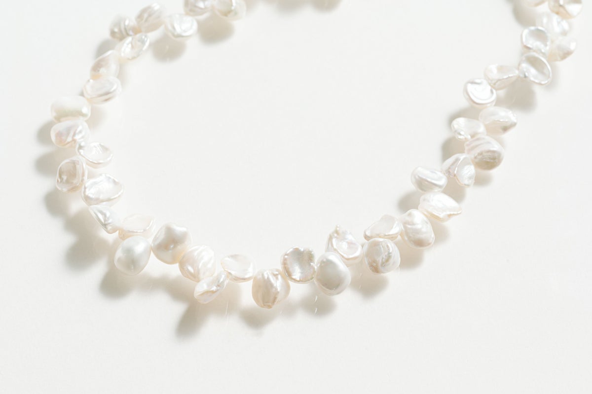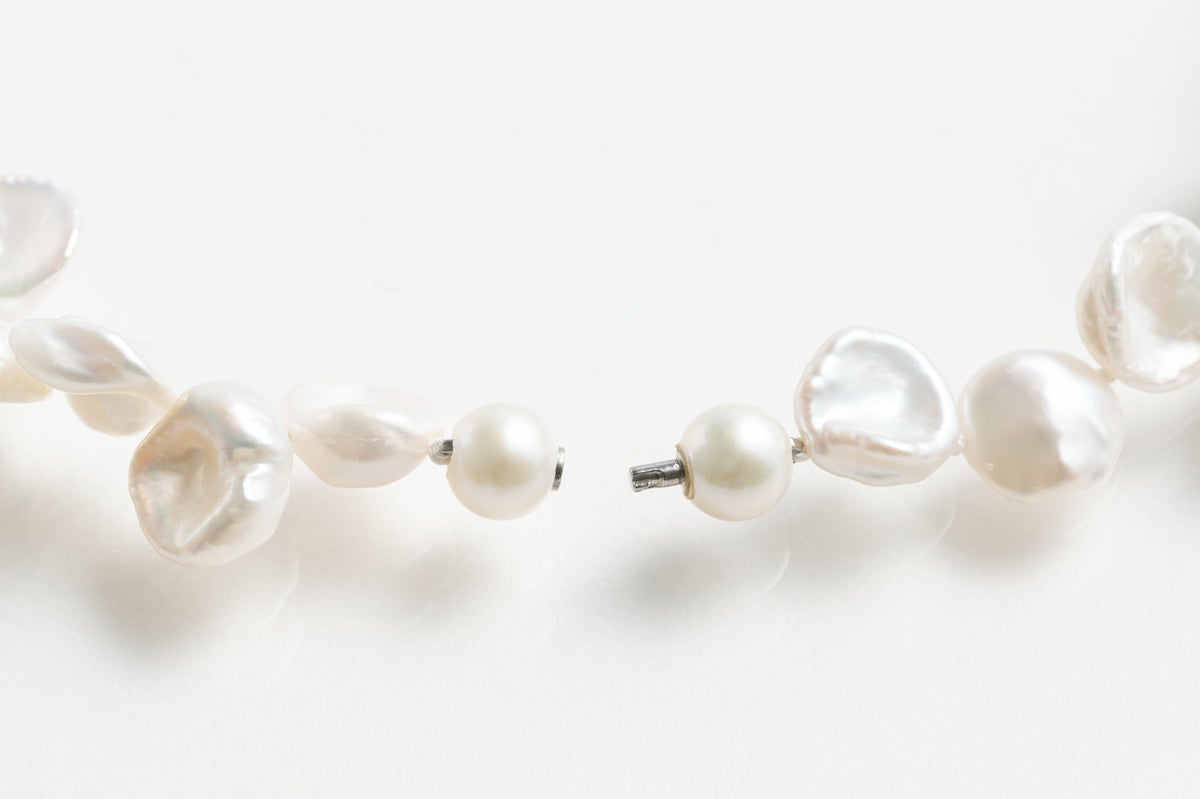 まるで花びらのような形が魅力的な淡水ペタルパール。今回はホワイトカラーでネックレスに仕上げました。ボリューム感満載で首元を華やかに演出します。パールの中に埋め込まれた<MADAMA>オリジナルのクラスプは、回しながら差し込みねじると留められ、互いを押し合いねじると外れます。つなぎ目が見えず、どの角度からでもきれいにお着けいただけます。単品ではもちろん、他のモジュールと組合わせて色々なデザインのロングネックレスとしてもお楽しみいただけます。ぜひ自分だけのパールスタイリングをお楽しみください。