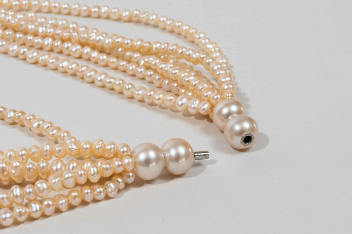自然が育んだ美しいオレンジピンクの淡水ケシパールを6連にしたネックレス。ボリューム感があり、クラスプ部分は2珠ずつラウンドの珠が入るのでつなぎ目がアクセントにもなるデザイン。肌馴染みのいいオレンジピンクカラーは首元を明るくしてくれます。パールの中に埋め込まれた<MADAMA>オリジナルのクラスプは、回しながら差し込みねじると留められ、互いを押し合いねじると外れます。つなぎ目が見えず、どの角度からでもきれいにお着けいただけます。単品ではもちろん他のモジュールと合わせればロングネックレスとしてもお楽しみいただけます。