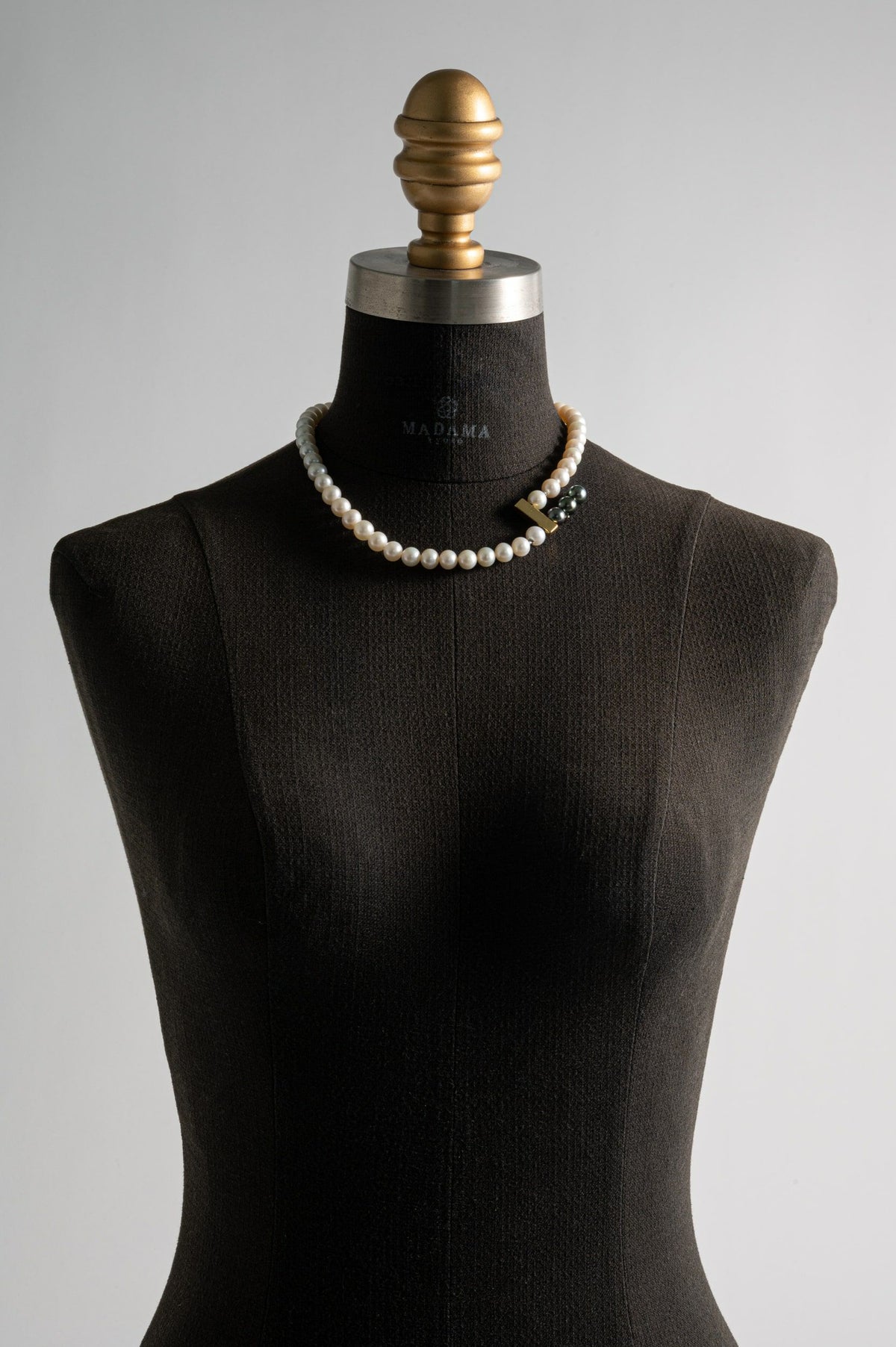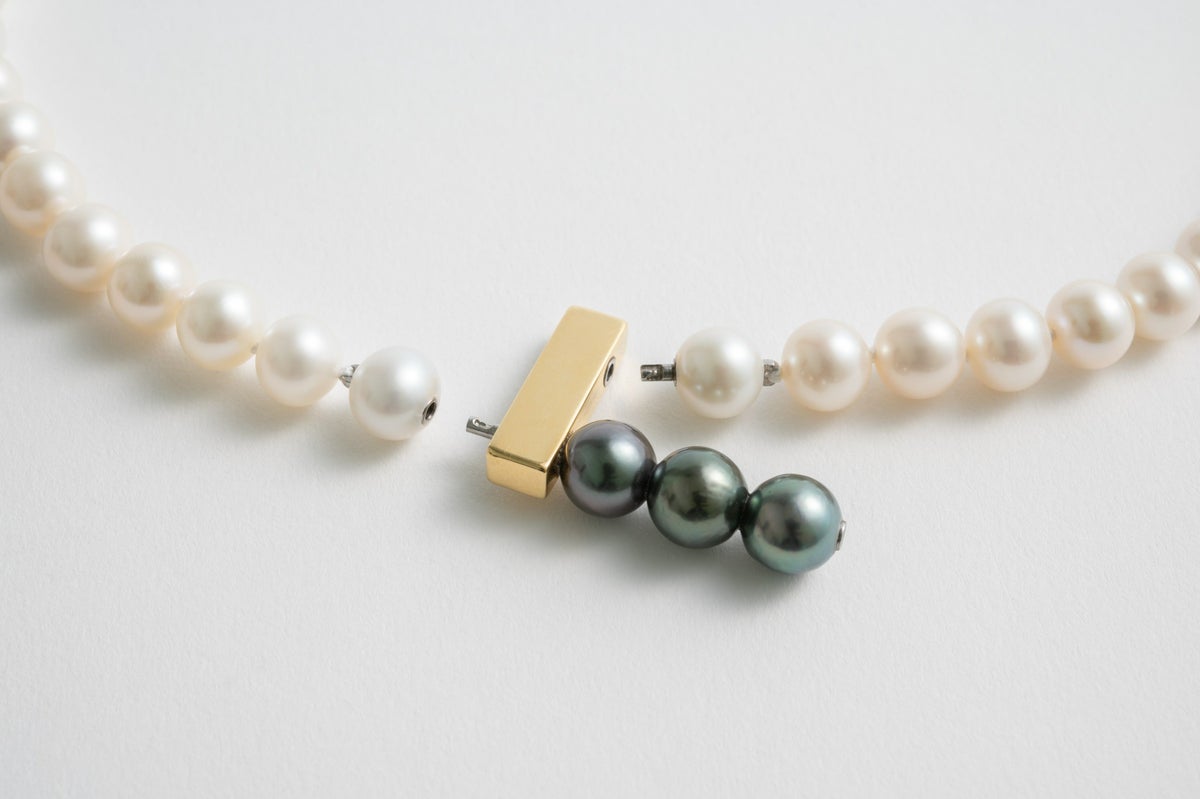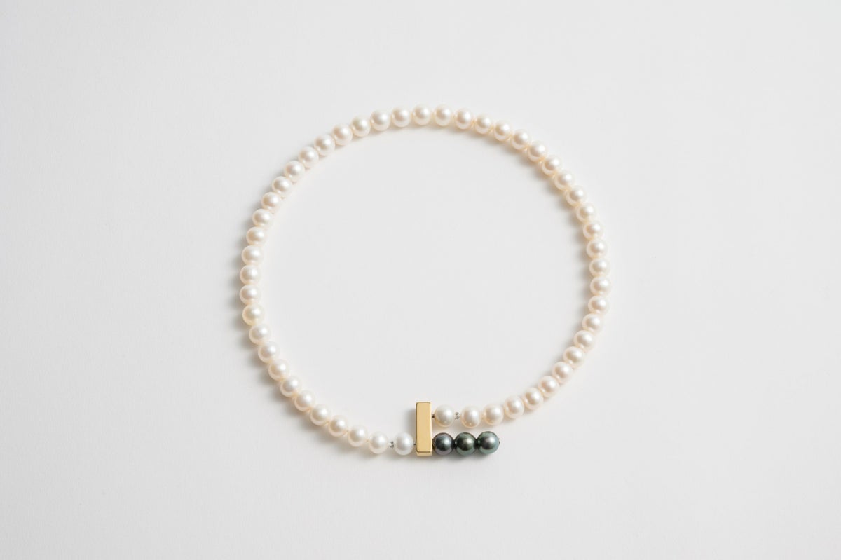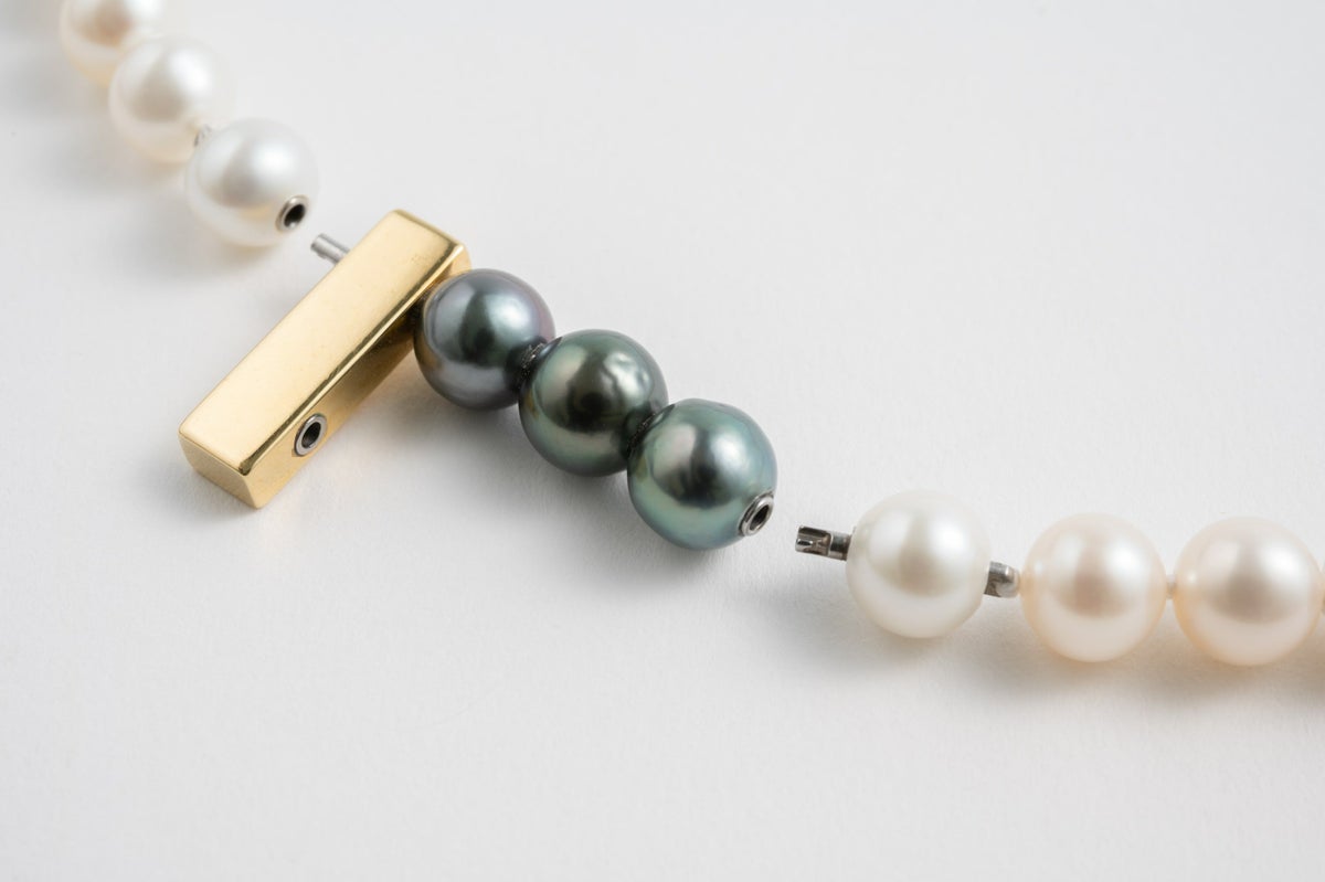 MADAMAの最大の特徴であるモジュールシステム。ゴールドのバーデザインのモチーフに黒蝶パールを3珠連ねたアイテムは中にクラスプを内蔵してるのでデザインのアクセントとになるジョイントになります。8mmの存在感ある淡水パールに合わせれば、他にはないシャープなデザインネックレスに。クラスプの位置を変えるだけでも雰囲気がとても変わるので、スタイリングに合わせてお楽しみいただけます。パールの中に埋め込まれた<MADAMA>オリジナルのクラスプは、回しながら差し込みねじると留められ、互いを押し合いねじると外れます。つなぎ目が見えず、どの角度からでもきれいにお着けいただけます。黒蝶パールのクラスプに入れればバーがT字のようなアクセントに。バー部分のクラスプに入れれば連が変形した個性的なデザインをお楽しみいただけます。
