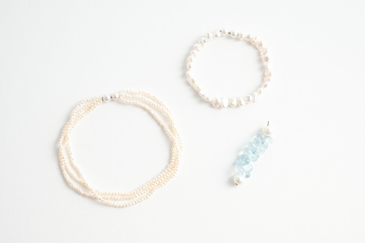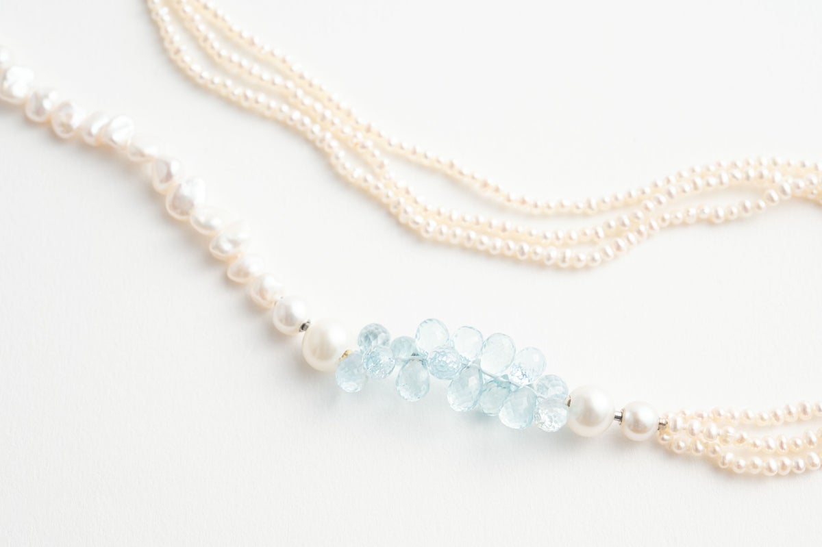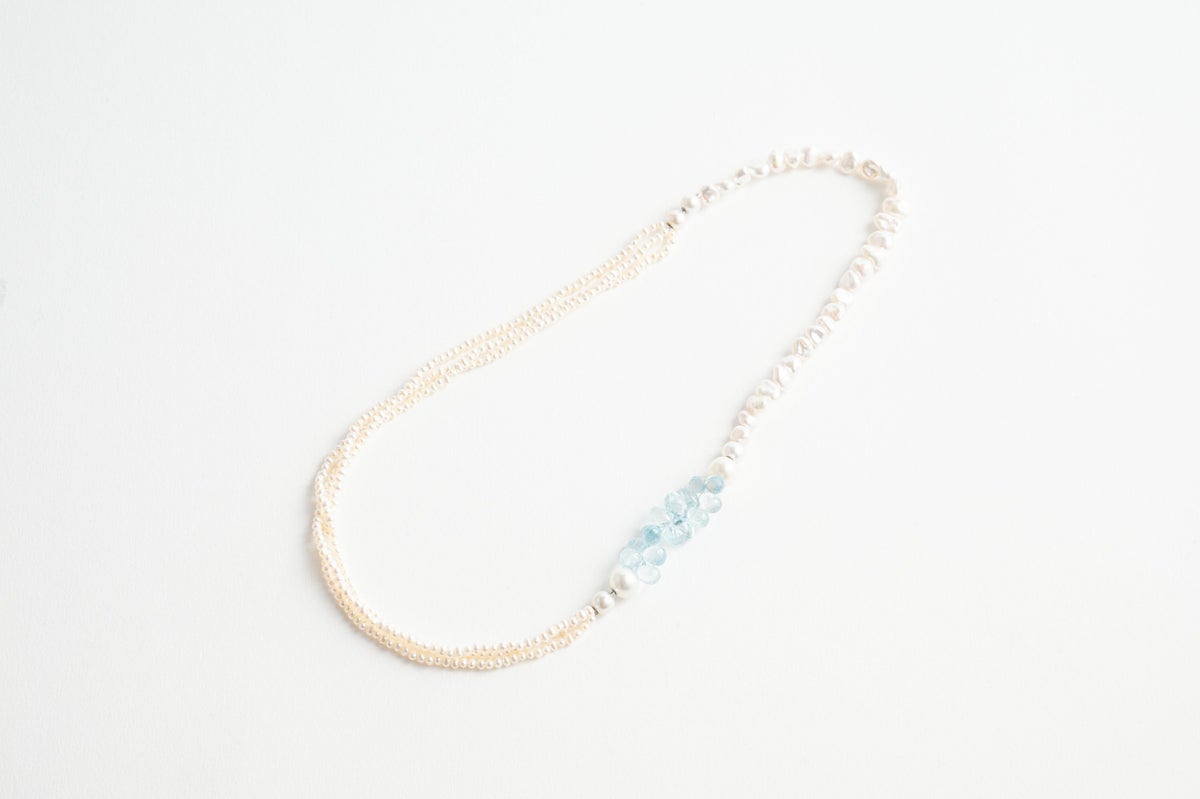 MADAMAで人気のカラーストーンシリーズ。今回新たにクリアなアクアマリンのショートモジュールが登場。淡水ケシパール3連と自然が育んだ個性豊かなバロックパールのモジュールを合わせた他にはないデザインネックレスに。ドロップ型のアクアマリンを房の様に仕立てたショートモジュールは、石に細かなカットが入っているので光が当たるとしっかりと輝き、クリアな透明感をより一層引き立てます。パールの中に埋め込まれた<MADAMA>オリジナルのクラスプは、回しながら差し込みねじると留められ、互いを押し合いねじると外れます。つなぎ目が見えず、どの角度からでもきれいにお着けいただけます。単品でもブレスレット、アンクレットとしてもお使いいただけます。組み合わせ次第で色々なアイテムとしてお楽しみ下さい。