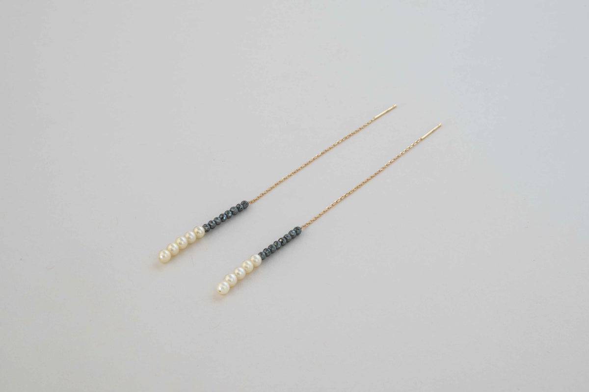 カットで煌めき豊かなヘマタイトに無調色真珠ならではの希少なベビーサイズのクリームカラーのアコヤパールを2トーンでまとめたアメリカンピアス。繊細なチェーンで顔周りを華やかに揺らめきます。その日の気分で長さを変えてお楽しみください。