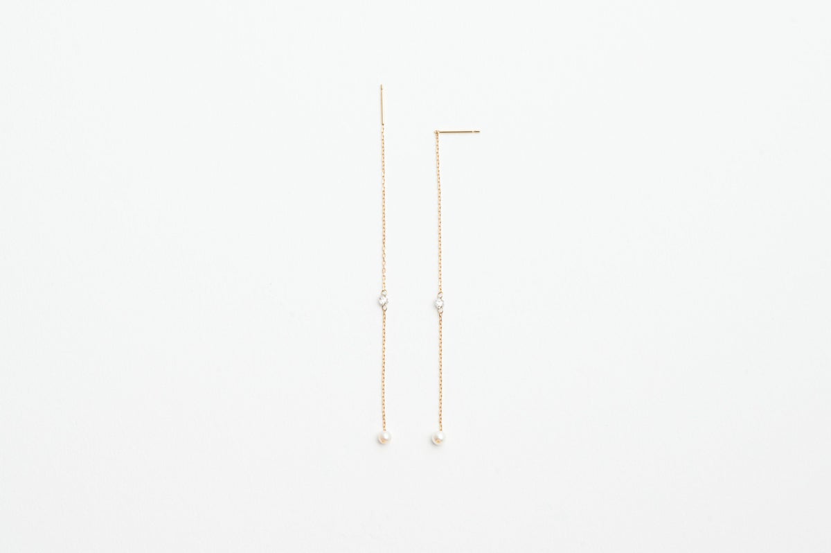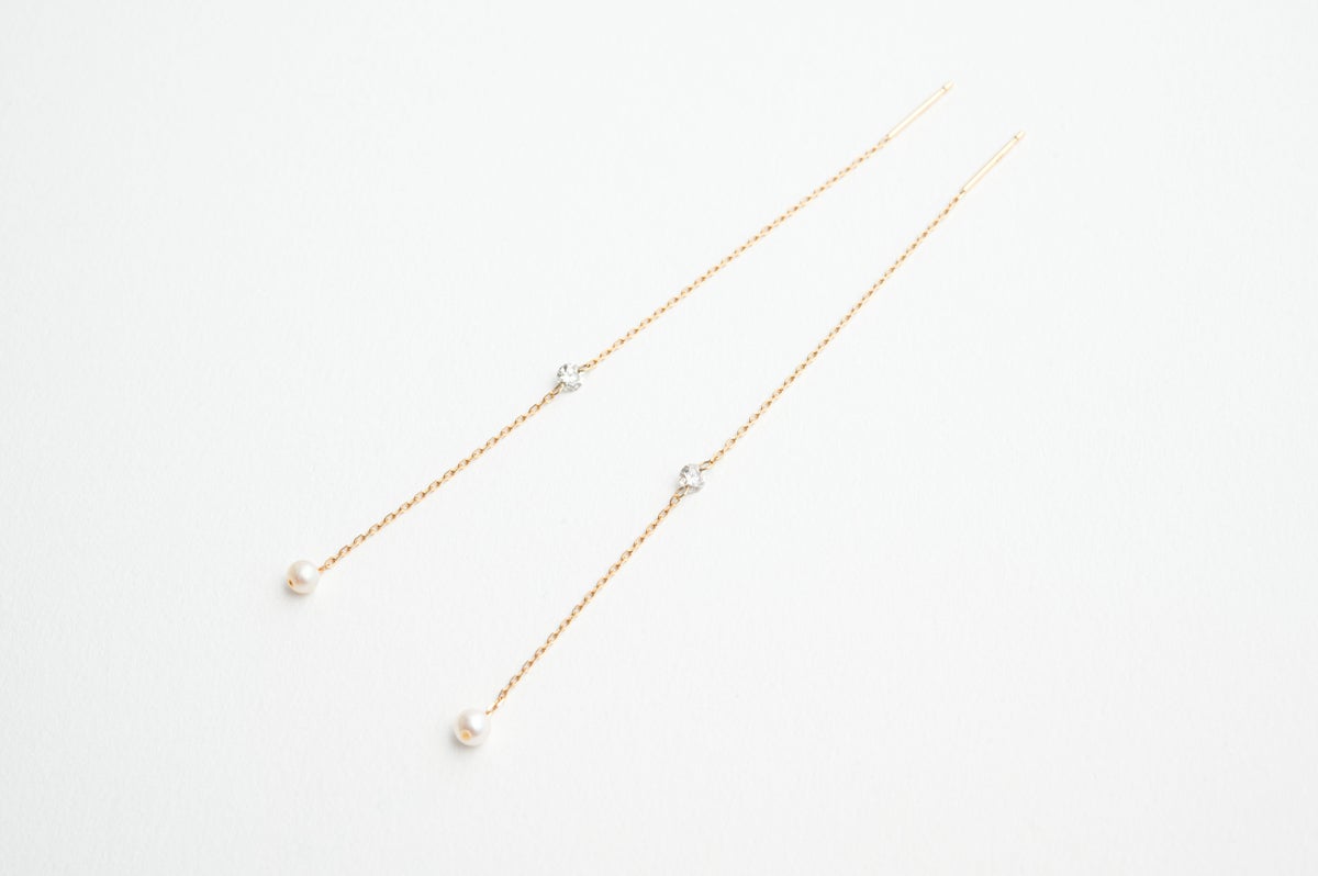 余計なデザインをそぎ落としたシンプルなアメリカンピアス。繊細なチェーンに小さなダイヤモンドで輝きをプラス。ダイヤモンドに直接チェーンを施すデザインは、小さくても顔周りにしっかりと輝きを与えてくれます。アコヤベビーパールがスイングしてより表情豊かな印象に。ダイヤモンドまでのチェーン部分で長さも調整できるので、その日の気分でお楽しみください。